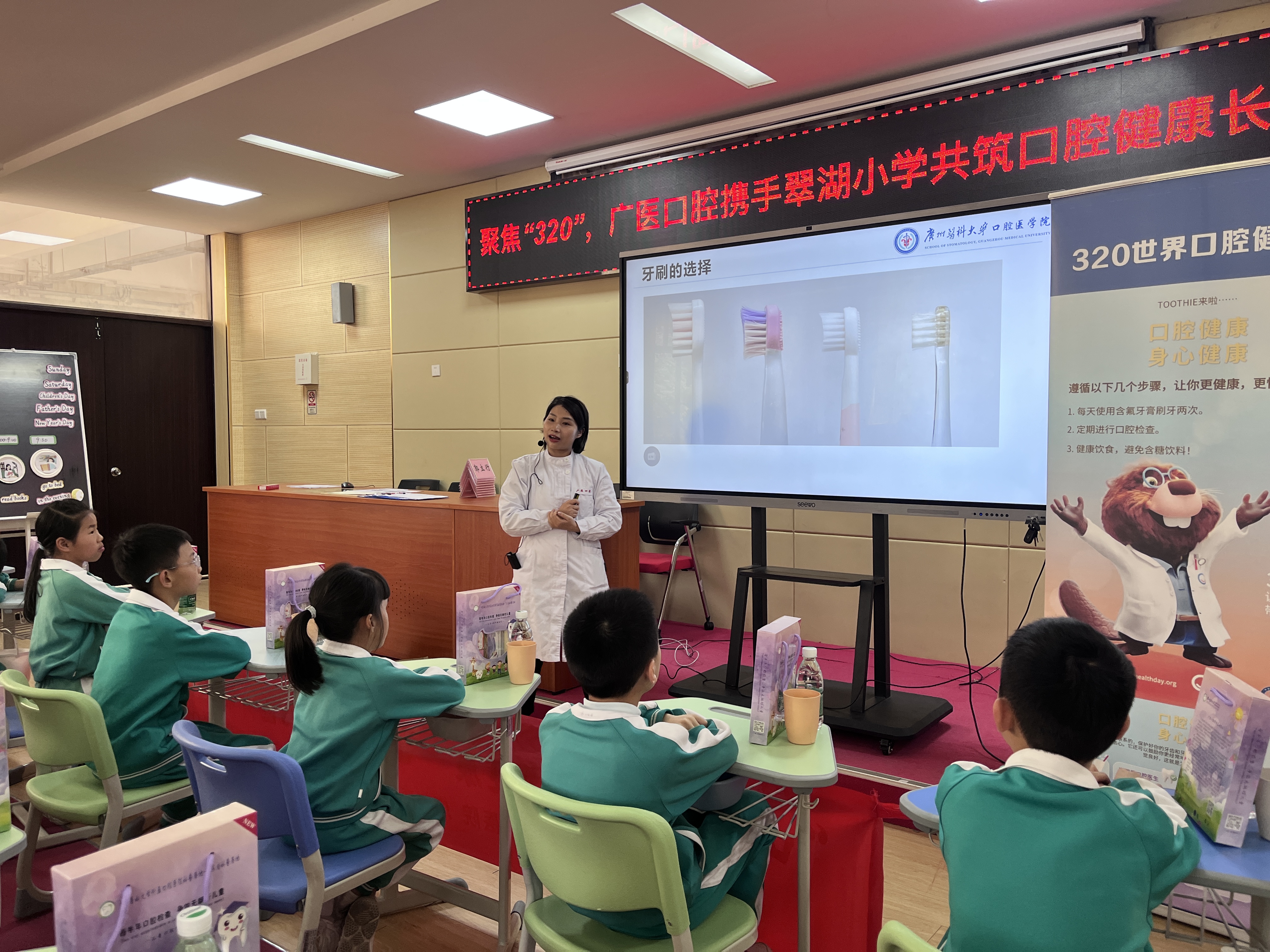 A school tooth brushing contest was held at Cuihu Primary School, located in Guangzhou, China, on March 20, 2025. 45 primary students participated in the contest, and a hundred students learned the correct way to brush their teeth through live broadcast. 45 students brushed their teeth on-site and were graded by judges. Every competitor received free oral hygiene gift sets. This contest was organized by the Affiliated Stomatology Hospital of Guangzhou Medical University.