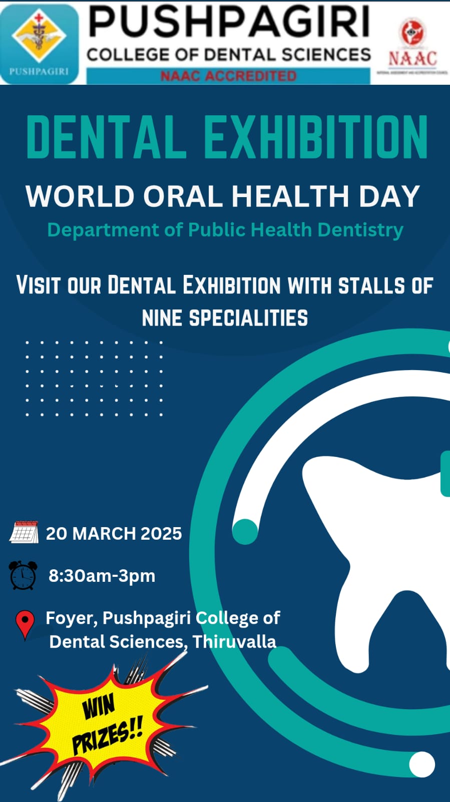 A Dental Exhibition was organized in the Foyer of Pushpagiri College of Dental Sciences for creating awareness on the importance of oral health and the various dental treatments in Dentistry. The Exhibition was conducted on 20th March 2025 from 8am to 3pm. Around 400 patients had visited the dental exhibition including school children. The exhibition had included stalls from 9 specialty departments- Oral Medicine and Radiology, Oral and Maxillofacial Surgery, Pediatric and Preventive Dentistry, Public Health Dentistry, Orthodontics, Periodontology, Prosthodontics, Conservative Dentistry and Endodontics and Oral and Maxillofacial pathology. Fun games were organized for children at the stall of Pediatric and preventive Dentistry.