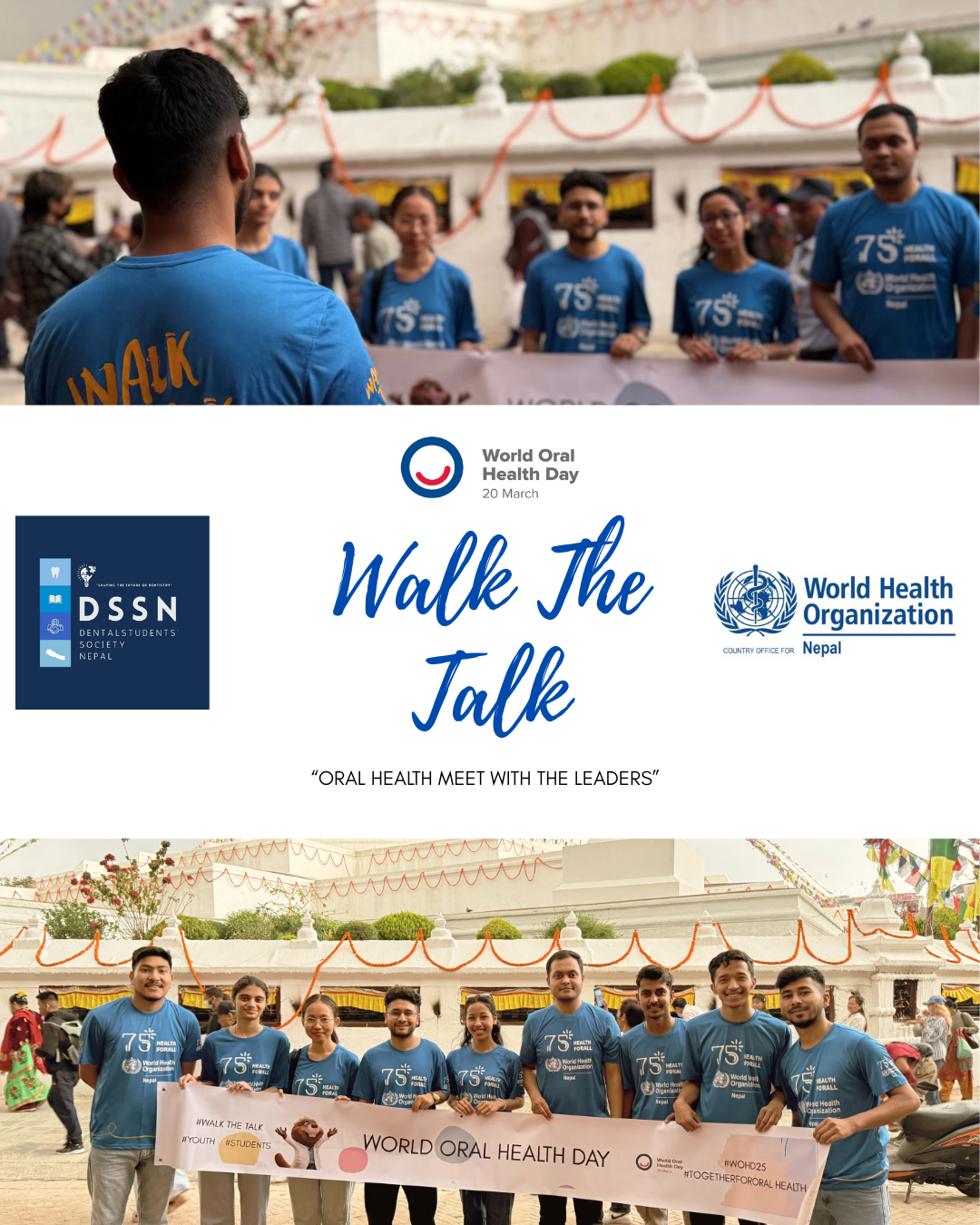 Society of Nepal, in collaboration with the World Health Organization- Nepal. The event was conducted in one of the World Heritage Site at Boudhanath Stupa on April 12, 2025. The event was an oral health talk and meeting session with the leaders and representatives of various medical students and youth organizations.