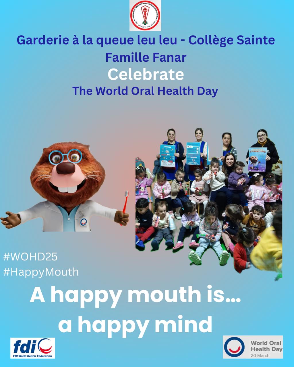 On the eve of World Oral Health Day, on 13th March 2025, the Lebanese Dental Association with Doctor Pamela Kassabian, organized an awareness campaign at the garderie A la queue leu leu at Sainte Famille school, Fanar, Lebanon to educate and motivate children about the importance of oral health. Proper brushing technique was demonstrated using models, followed by oral screening and distribution of toothbrush and toothpaste. A total of 136 children participated to this activity.