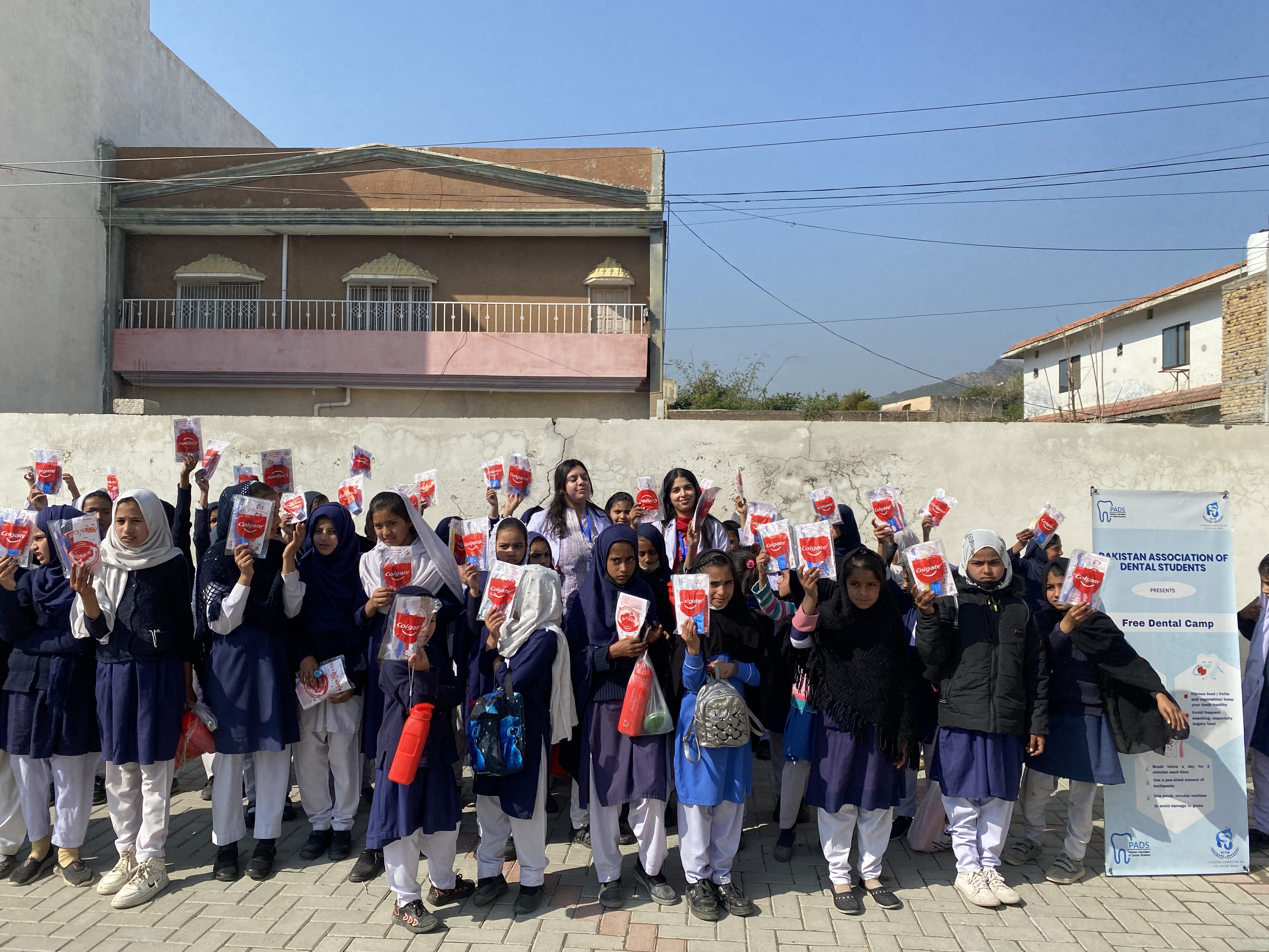 Each child received a dental hygiene kit including a toothbrush, toothpaste, and a flyer with oral care tips in Urdu for better understanding. - Referral for Advanced Care: