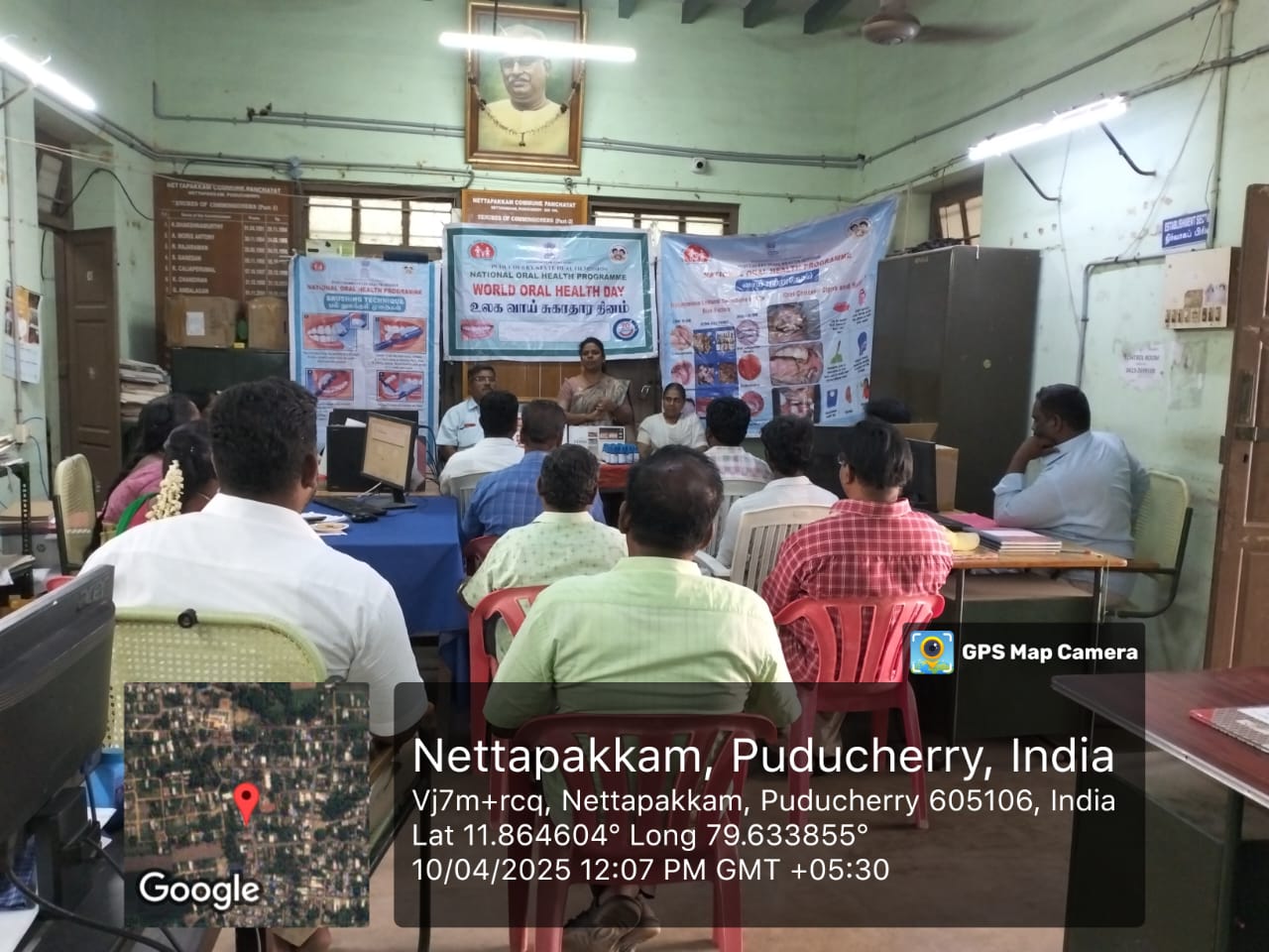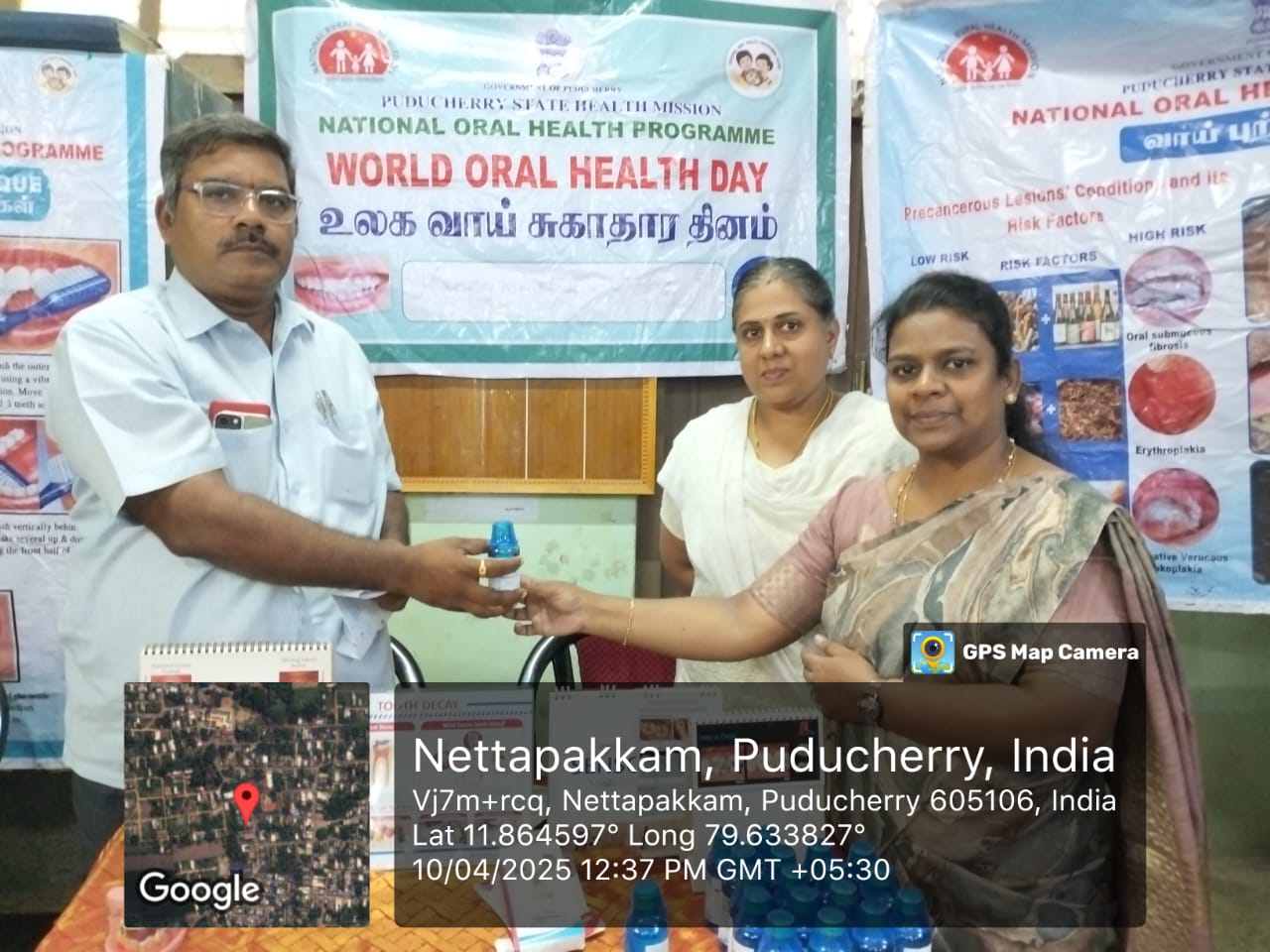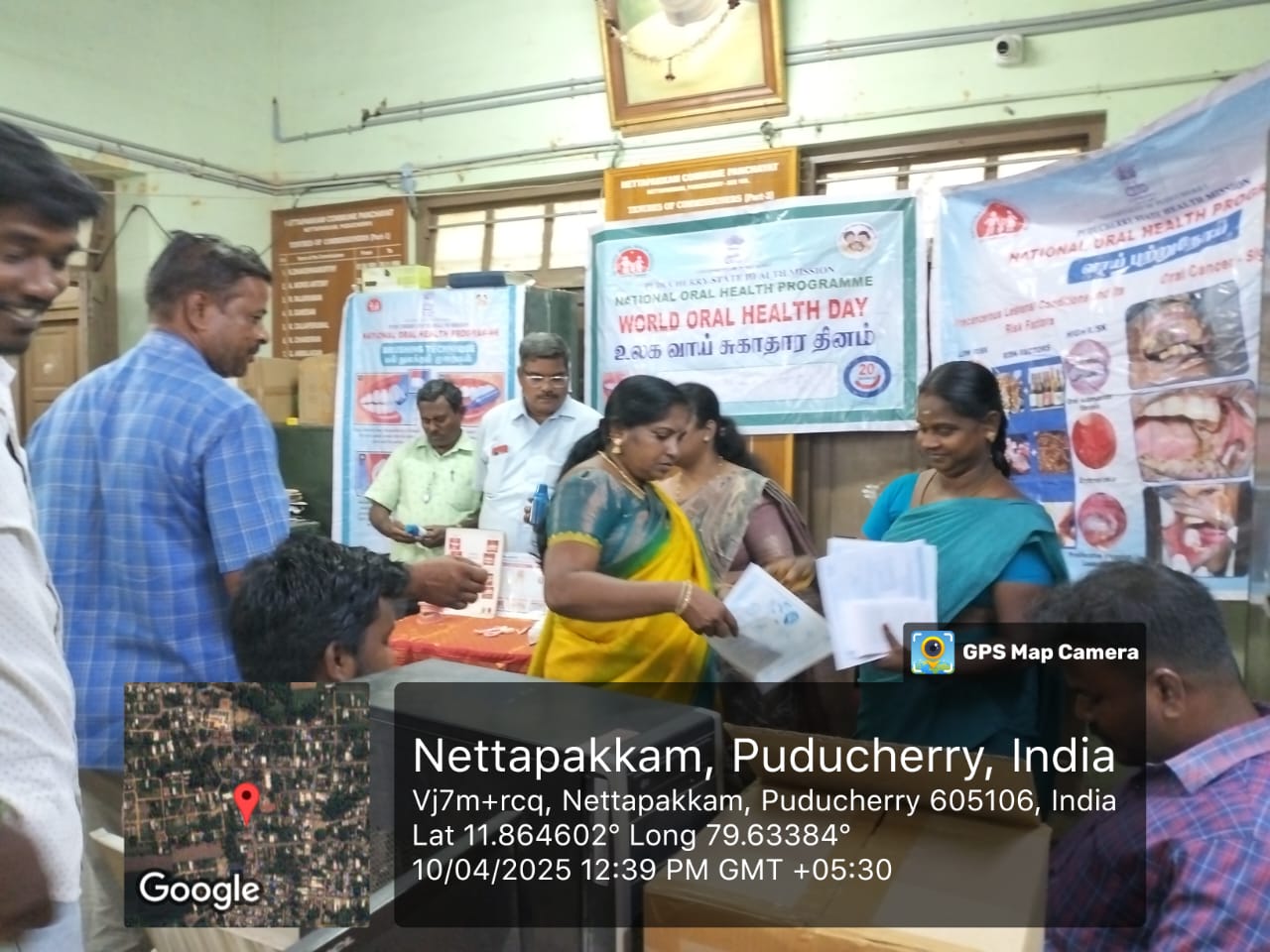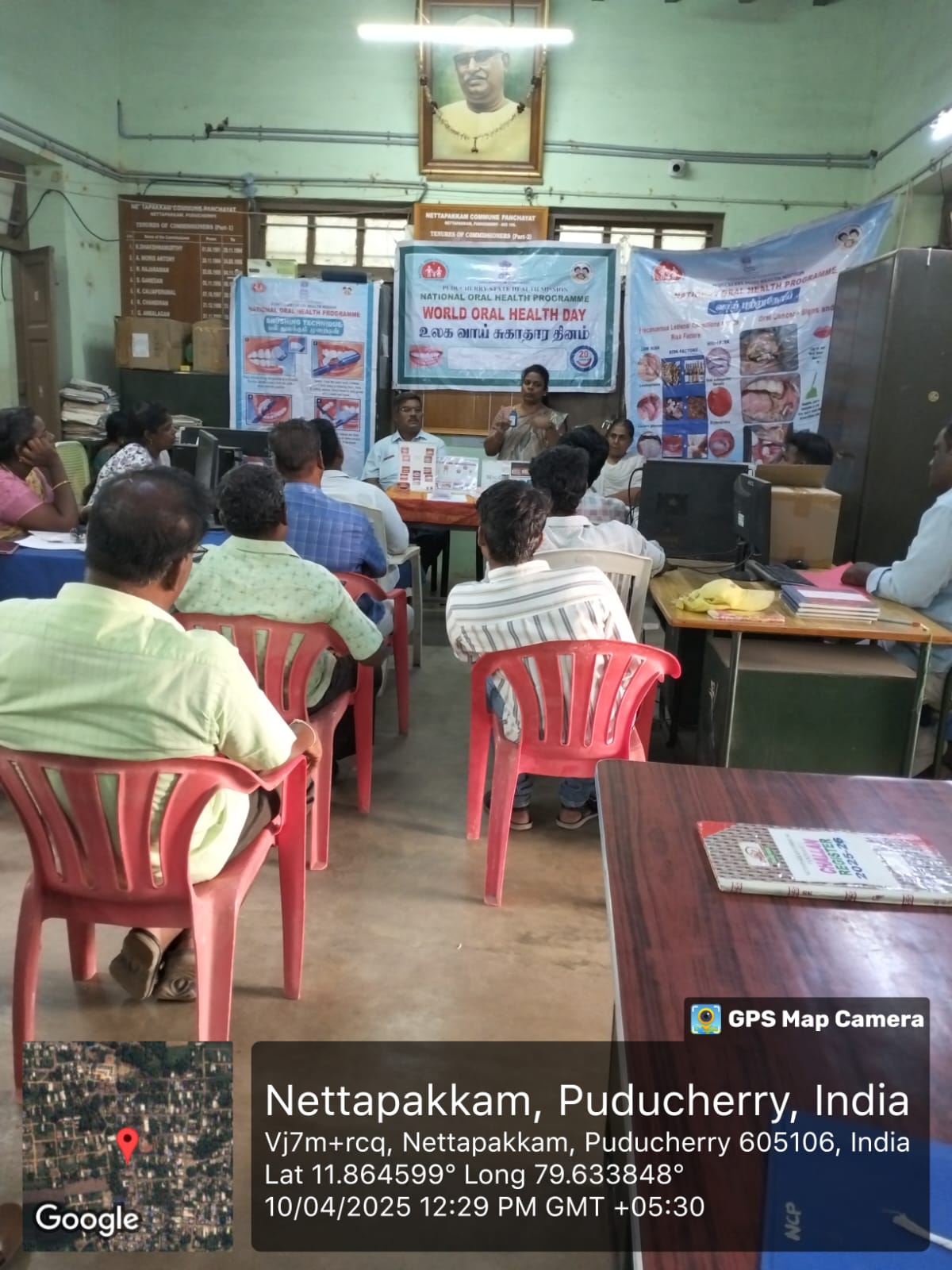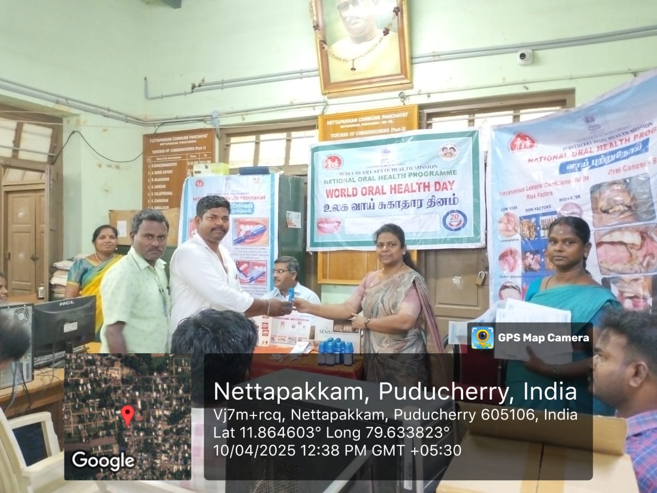 As part of the World Oral Health Day 2025 celebrations, an oral health awareness program was conducted at Nettapakkam Commune Panchayat under PHC Nettapakkam. The session covered the significance of oral health in relation to overall well-being, oral hygiene practices, do’s and don’ts of oral care, and the harmful impact of tobacco on health and society.