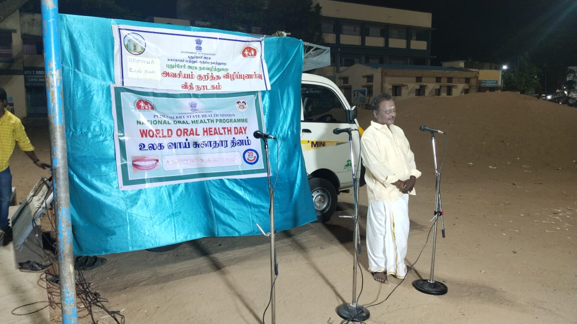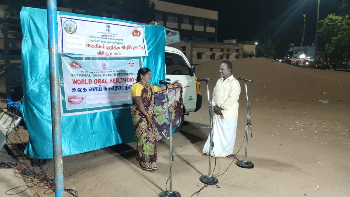 One of the highlights of this initiative was the use of “Theru Koothu”, a vibrant and deeply rooted Tamil street theatre tradition. Known for its expressive storytelling, colourful costumes, and engaging dialogues, Theru Koothu has long been a medium for social change. By incorporating oral health themes into this art form, we delivered impactful messages on the importance of brushing twice a day, avoiding tobacco, and seeking timely dental care—all in a way that resonated with the audience. Dental surgeons and oral health staff participated in these events making their contribution in spreading the message of oral health in the streets of Puducherry.