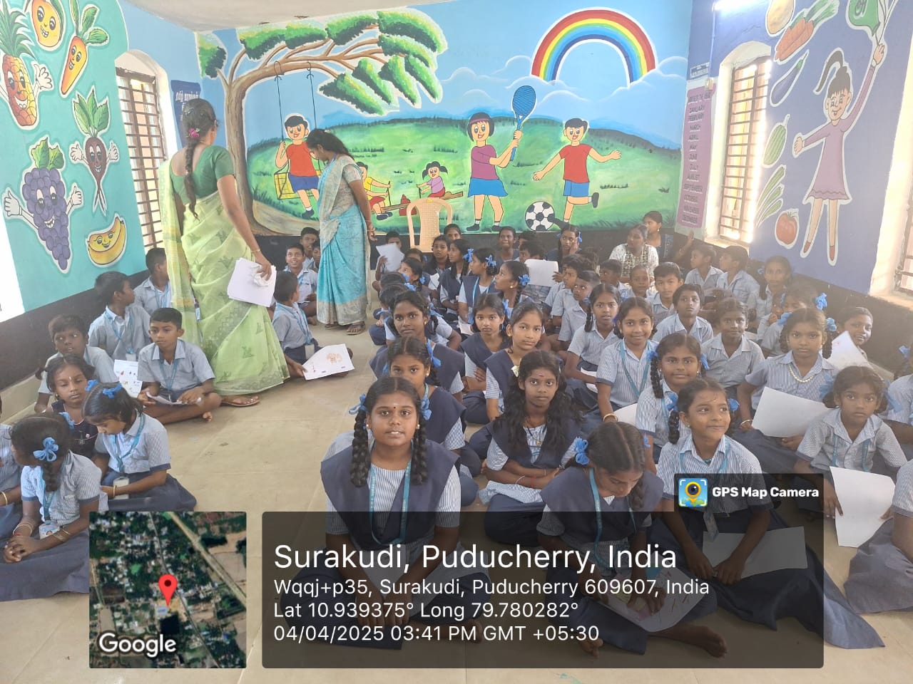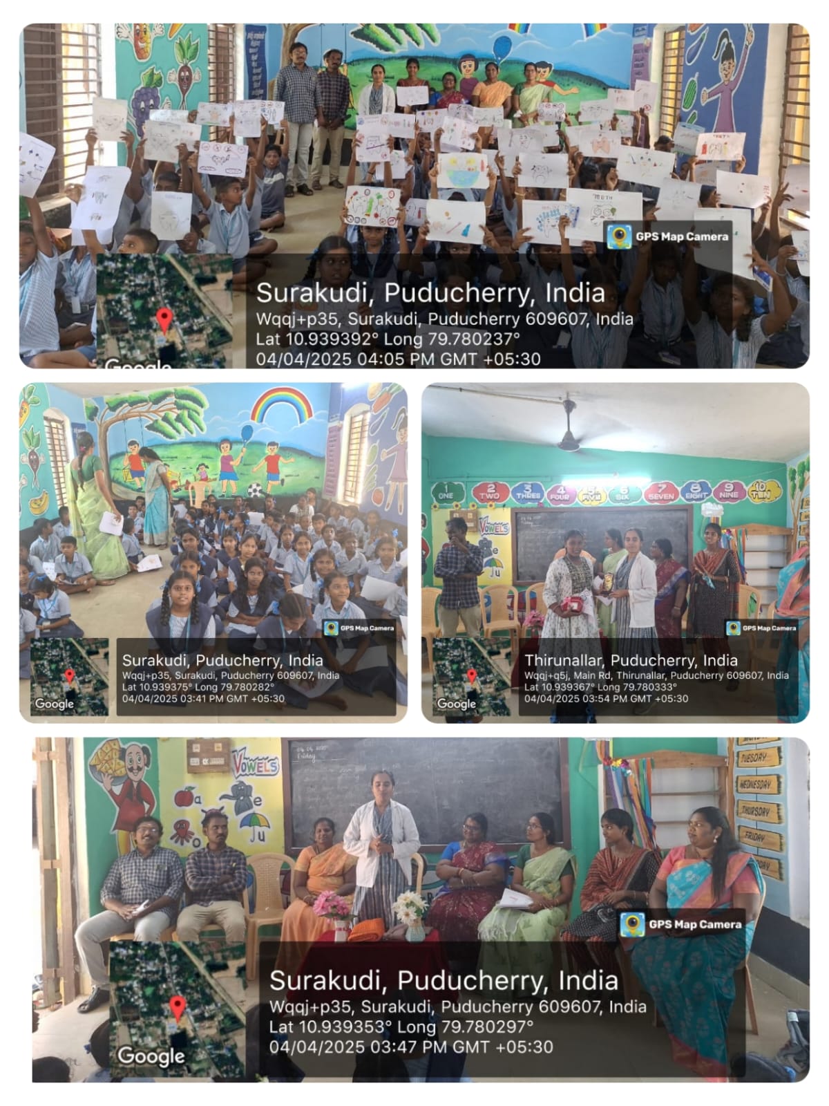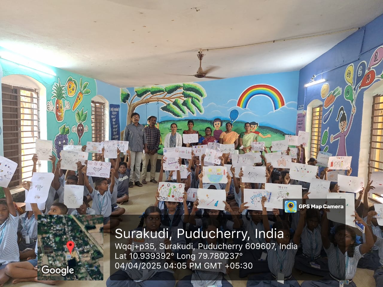 As part of the WOHD celebration, a drawing competition was conducted at Government Primary School, Surakudi, Thirunallar, with enthusiastic participation from students. Prizes were distributed to 85 students for their creative contributions.