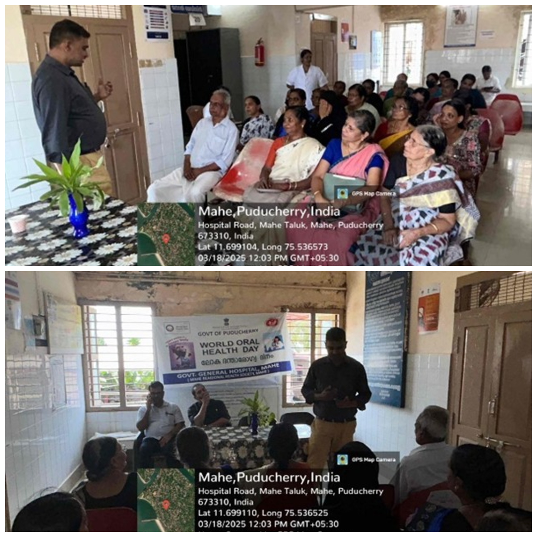 The National Oral Health Programme (NOHP) Puducherry organized a Geriatric Oral Health Awareness Lecture at Government Hospital (GH), Mahe, focusing on the oral health needs of the elderly population. As aging is often associated with various dental and systemic health challenges, this session aimed to educate senior citizens, caregivers, and healthcare professionals about the importance of maintaining oral hygiene in old age. By educating senior citizens, caregivers, and healthcare workers, the session promoted preventive care, early intervention, and improved quality of life for older adults. A healthy mouth contributes to a healthier aging process, making geriatric oral health awareness a key component of holistic elderly care. 21 benefitted