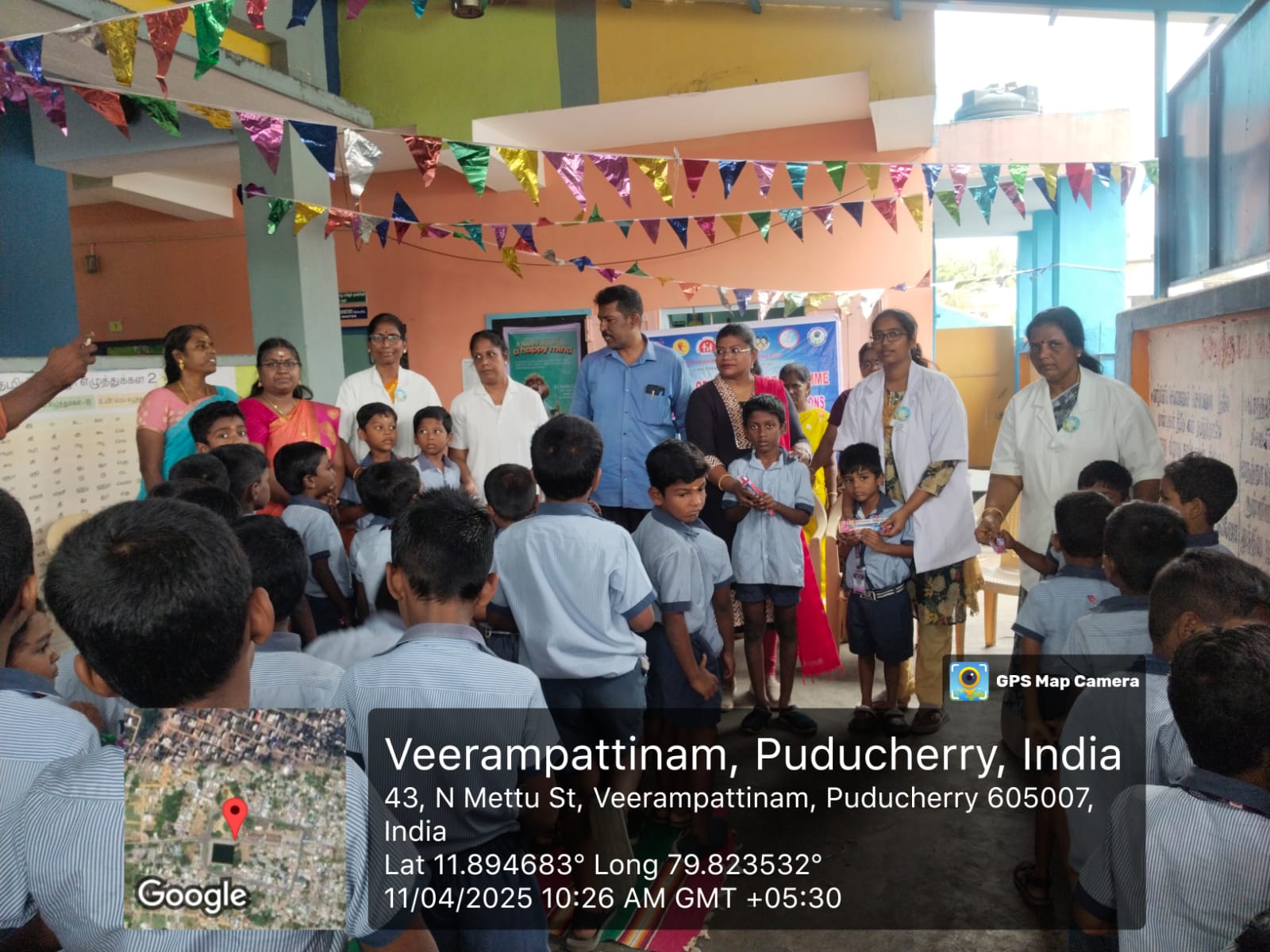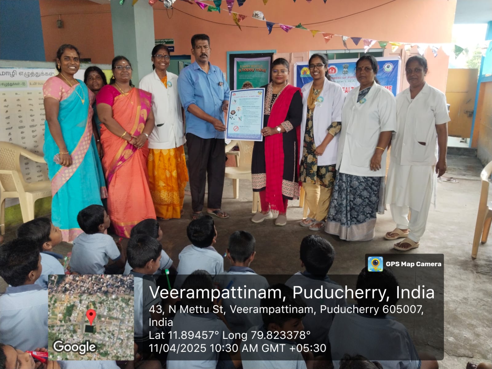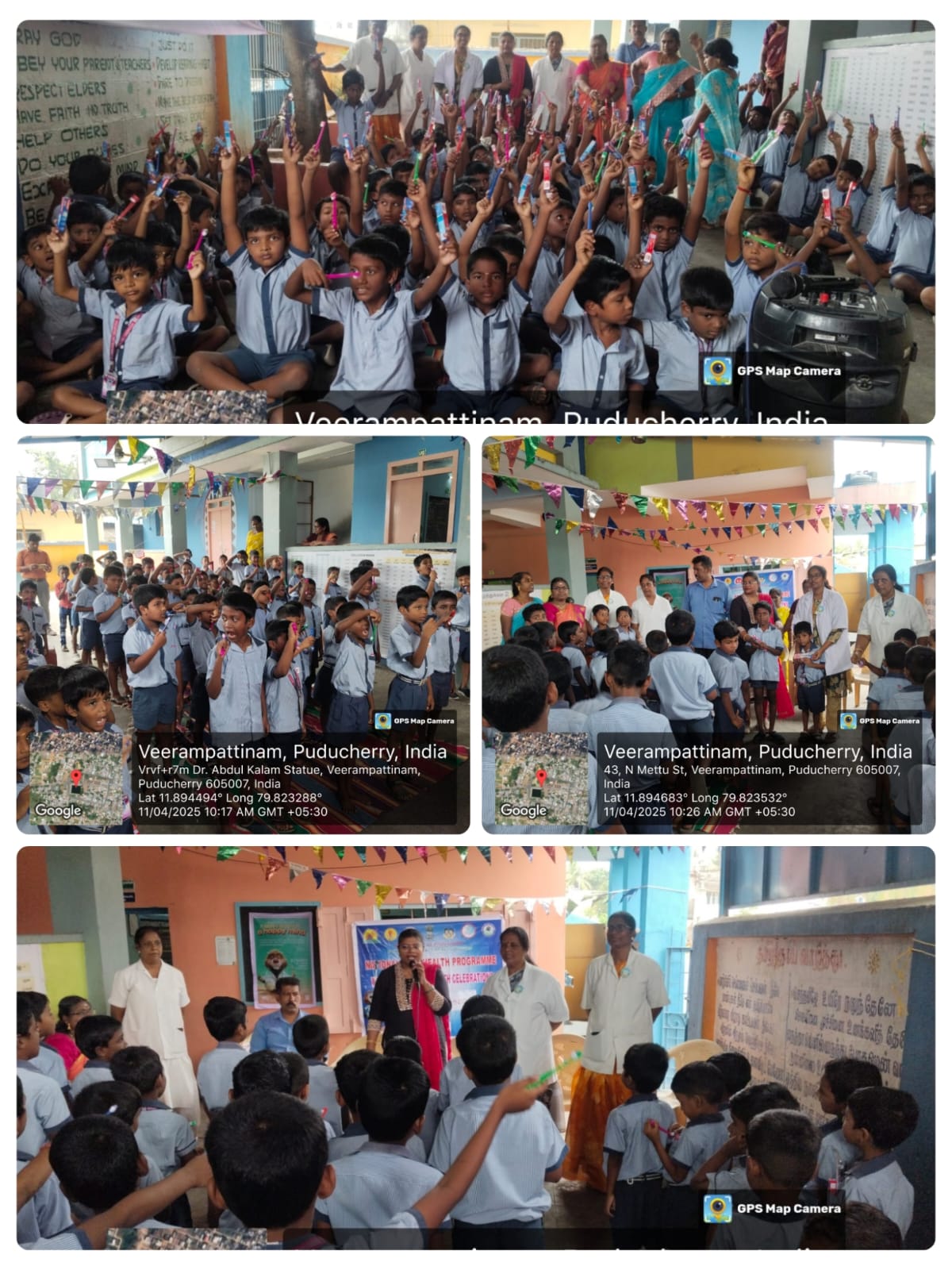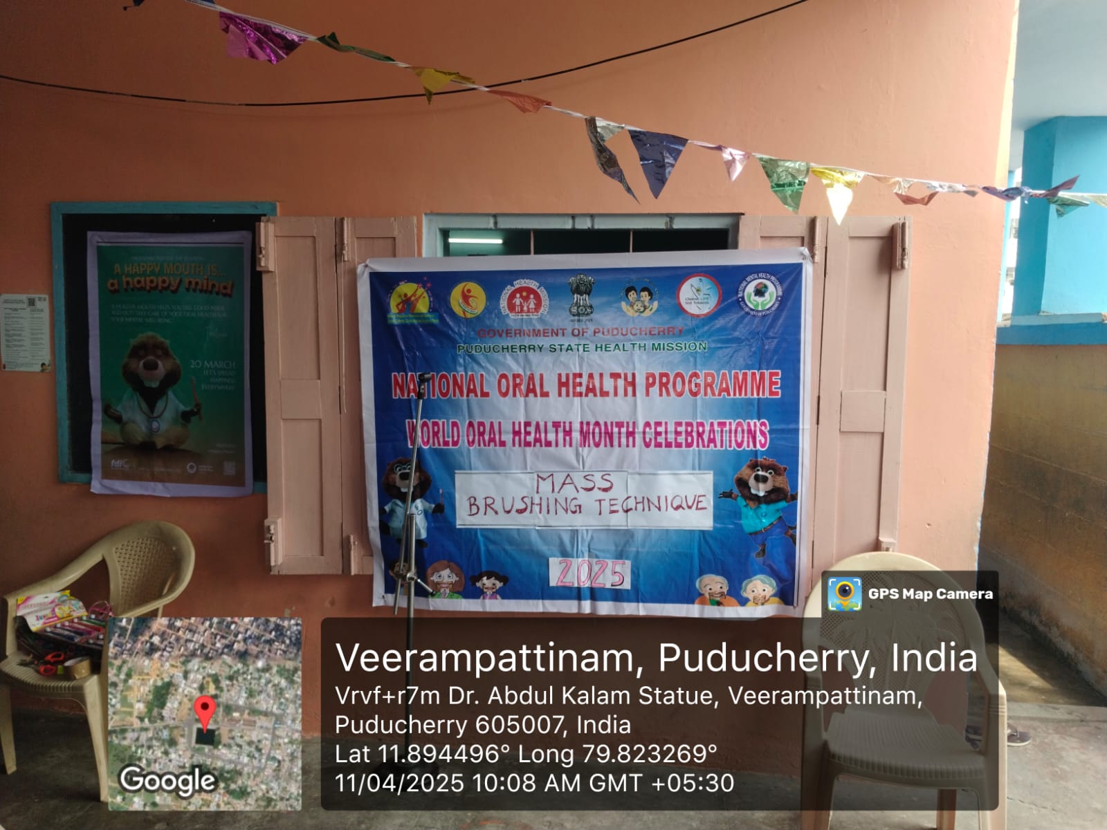 On April 11, 2025, GPS Veerampattinam, a government primary school, a mass tooth brushing program as part of World Oral Health Day celebrations, themed “A Happy Mouth is A Happy Mind was organized by the Mobile Dental Unit Team under the National Oral Health Programme, Government of Puducherry. This initiative aimed to promote oral hygiene among children in underserved communities.