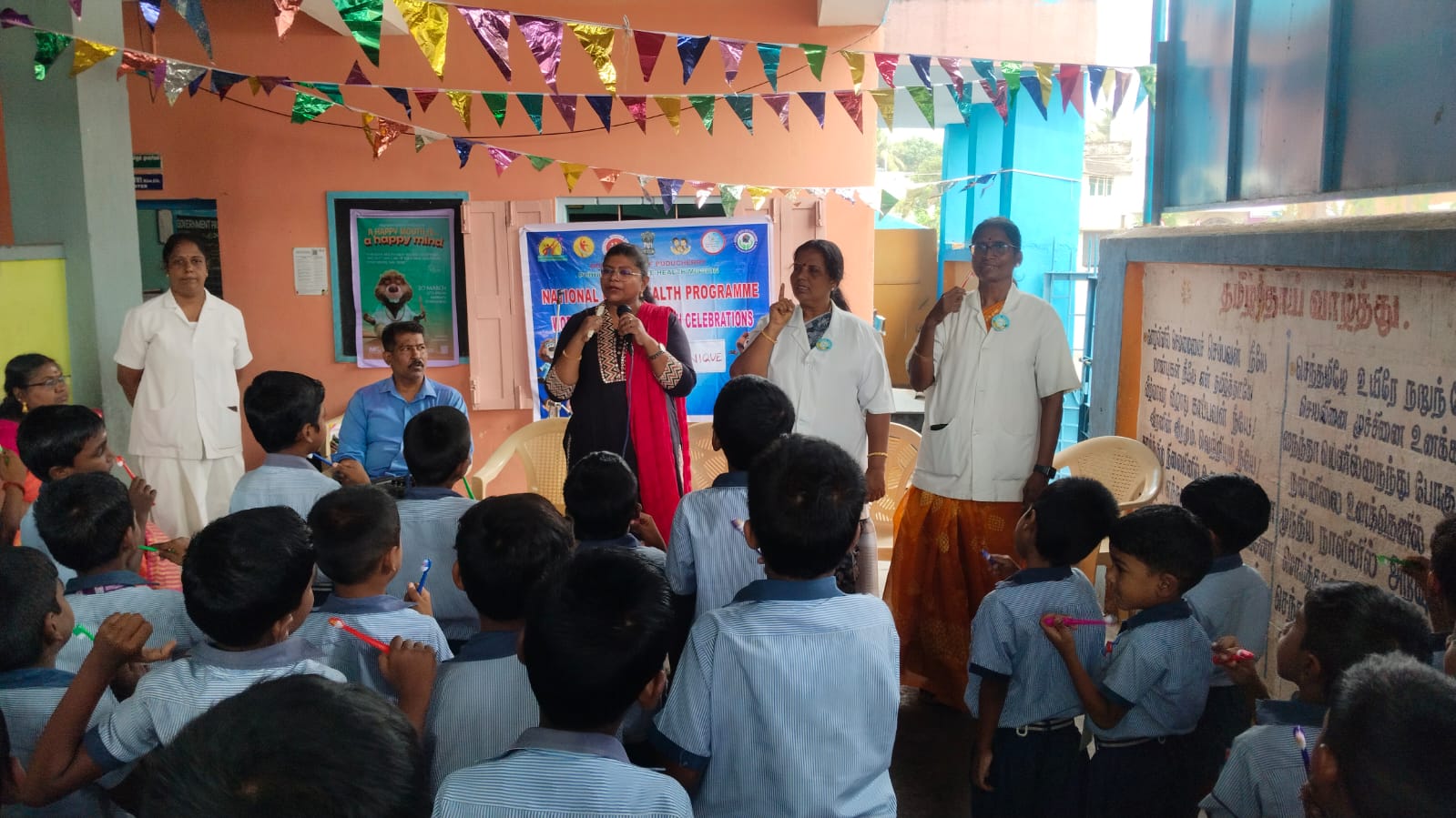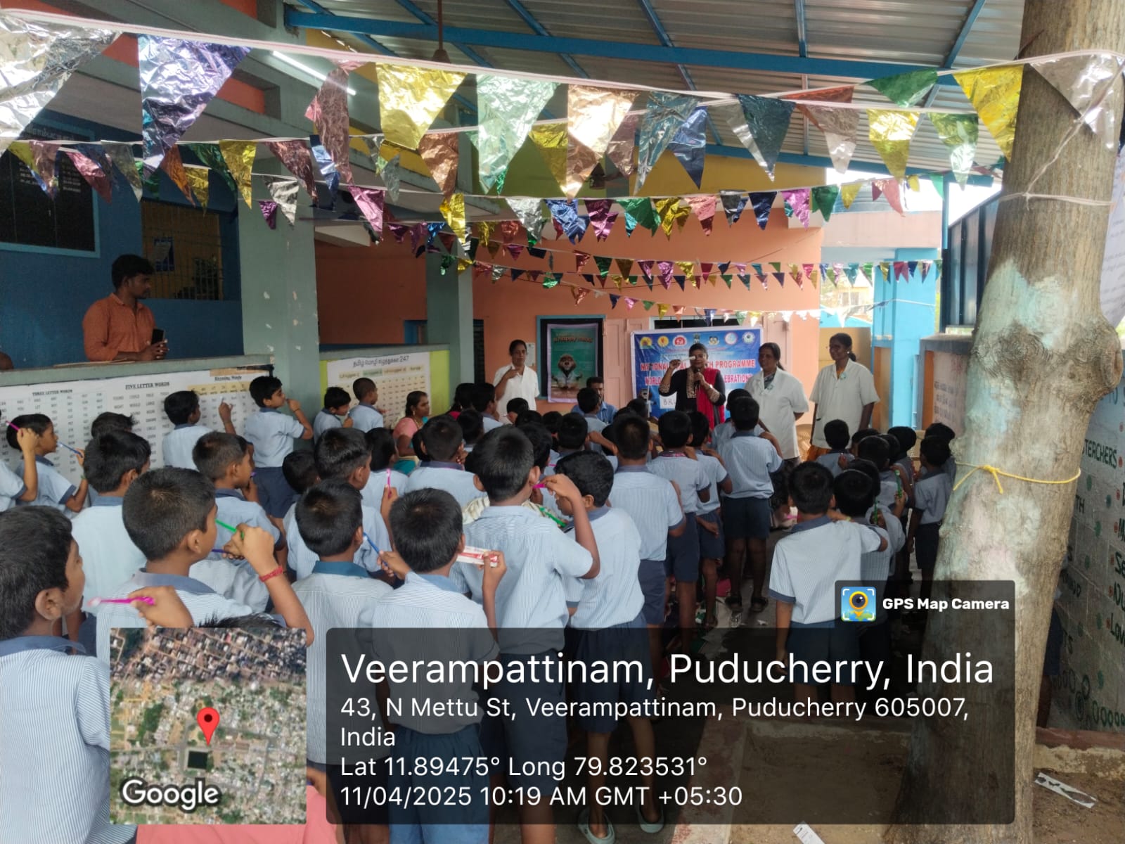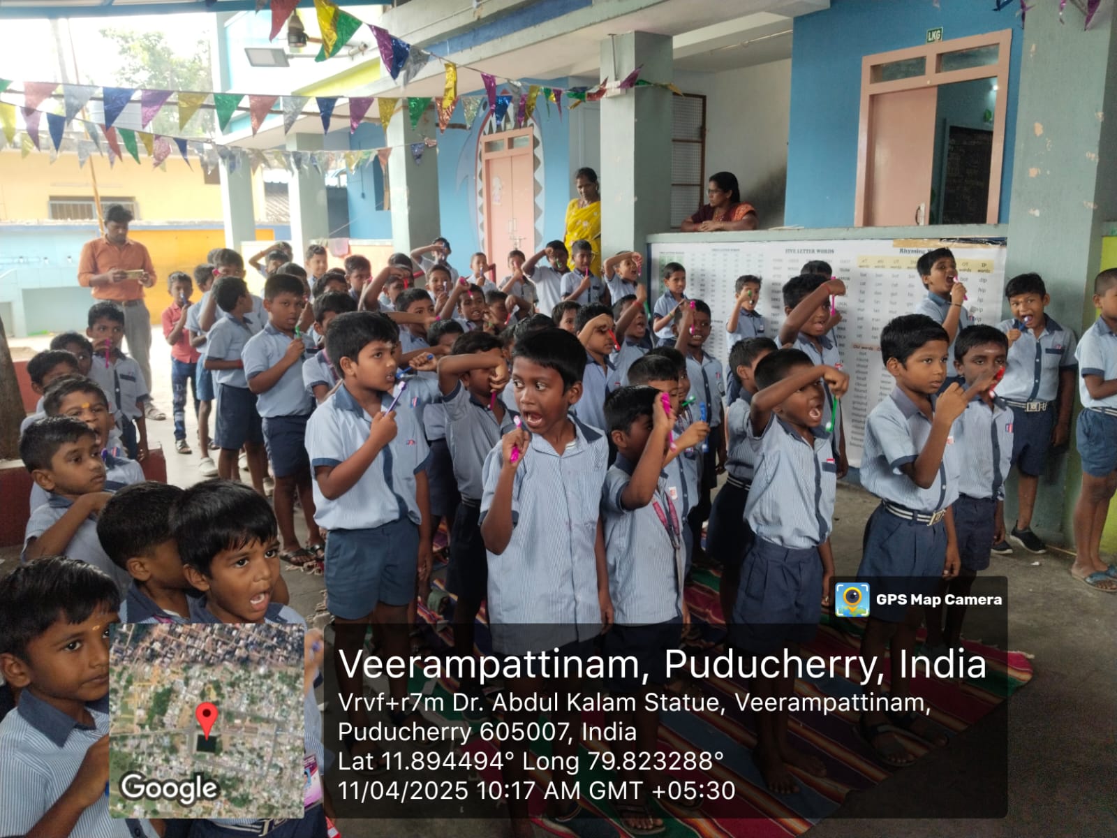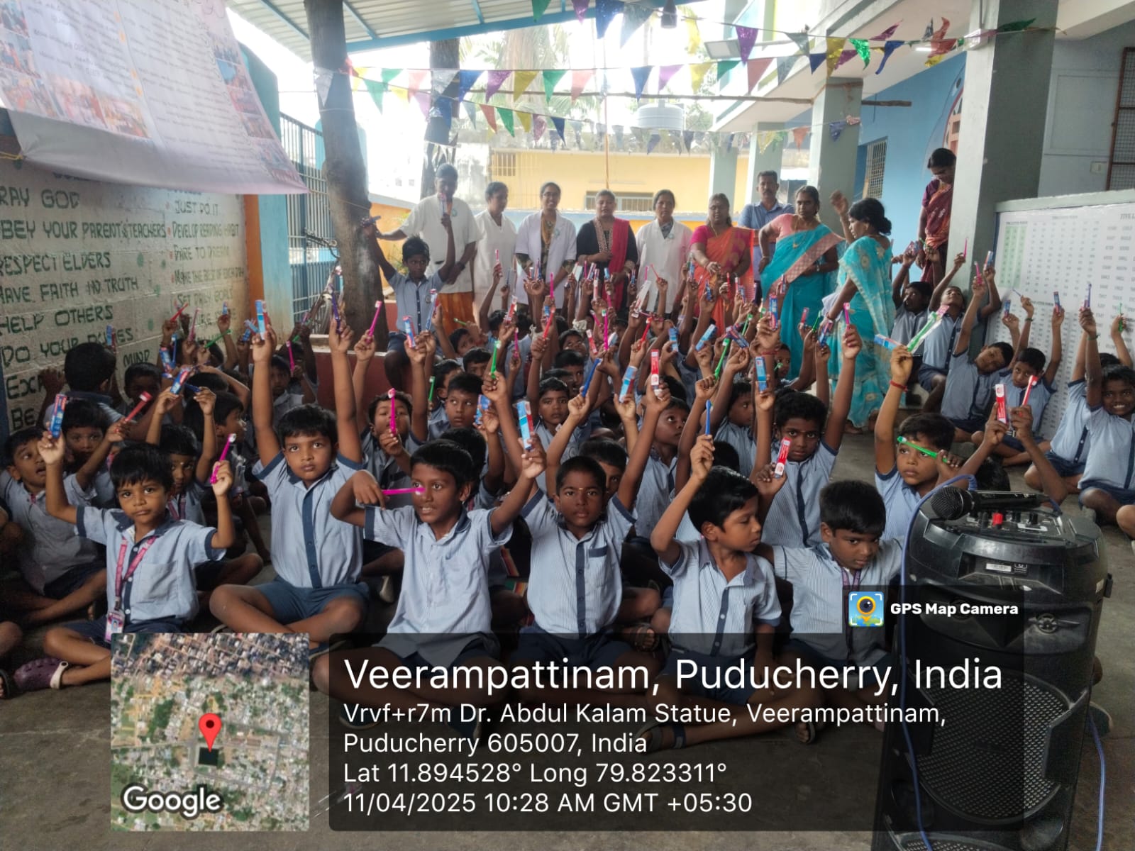 On April 11, 2025, GPS Veerampattinam, a government primary school, a mass tooth brushing program as part of World Oral Health Day celebrations, themed “A Happy Mouth is A Happy Mind was organized by the Mobile Dental Unit Team under the National Oral Health Programme, Government of Puducherry. This initiative aimed to promote oral hygiene among children in underserved communities.