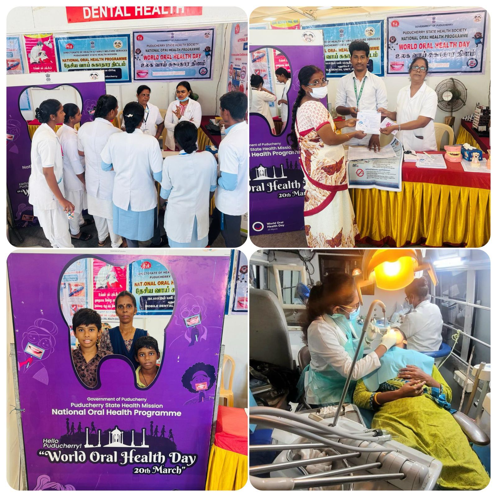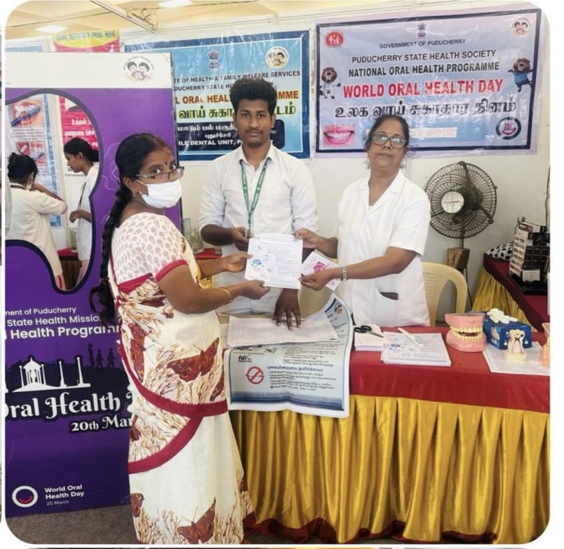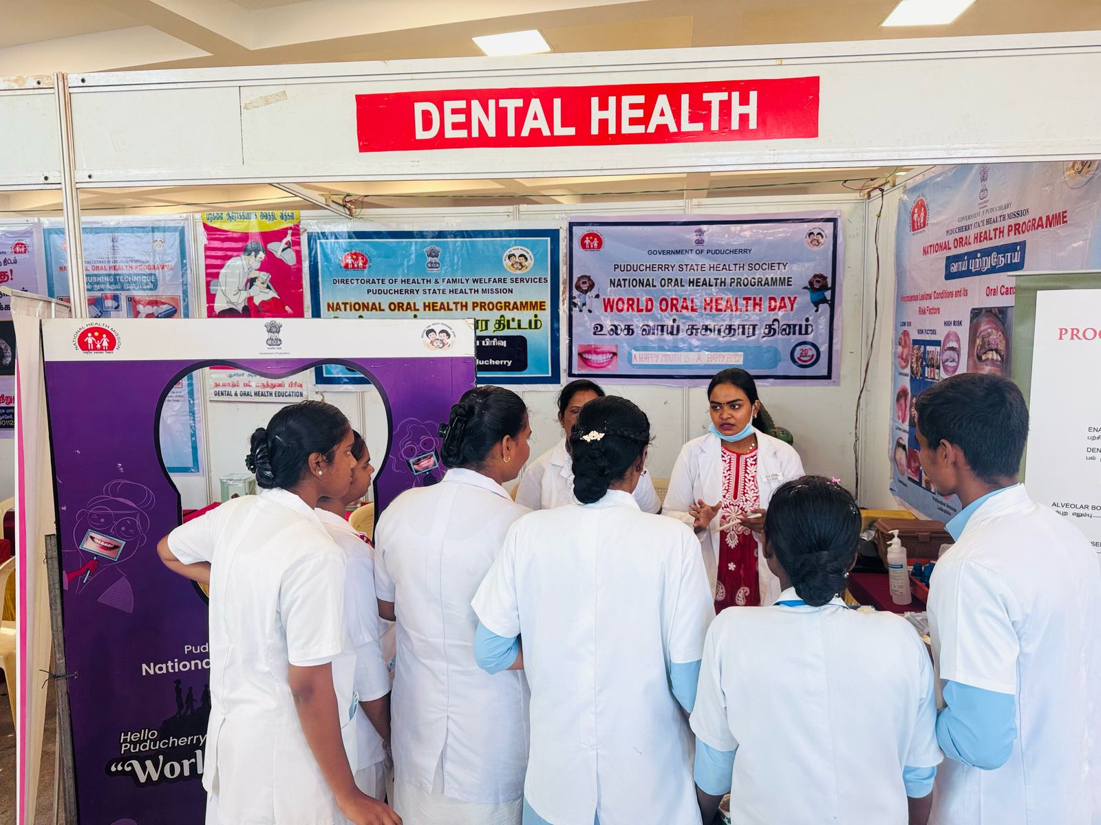 The health department government of Puducherry organised a mega health mela where stalls on the different specialities of medicine and all the programs of the national health mission put up awareness stalls for the benefit of the community. The National oral Health program, Puducherry in collaboration with Mahatma Gandhi Post graduate Institute of Dental Sciences participated in this health mela and conducted awareness sessions, dental screening and treatments with the help of Mobile dental vans. This awareness and treatment camp was conducted for 3 days at Kamarajar mani mandabam a public exhibition venue in Puducherry.