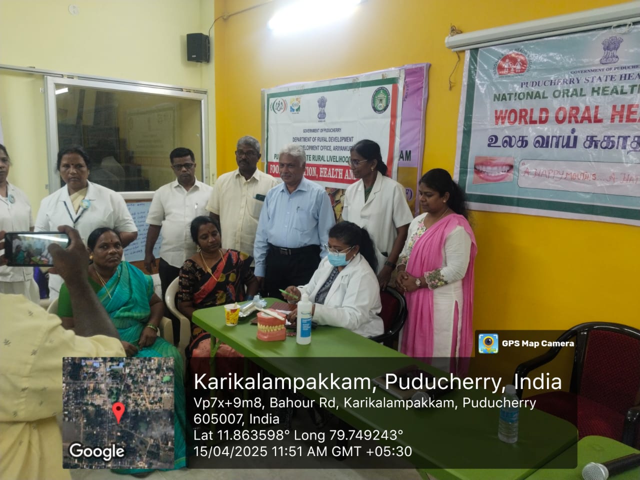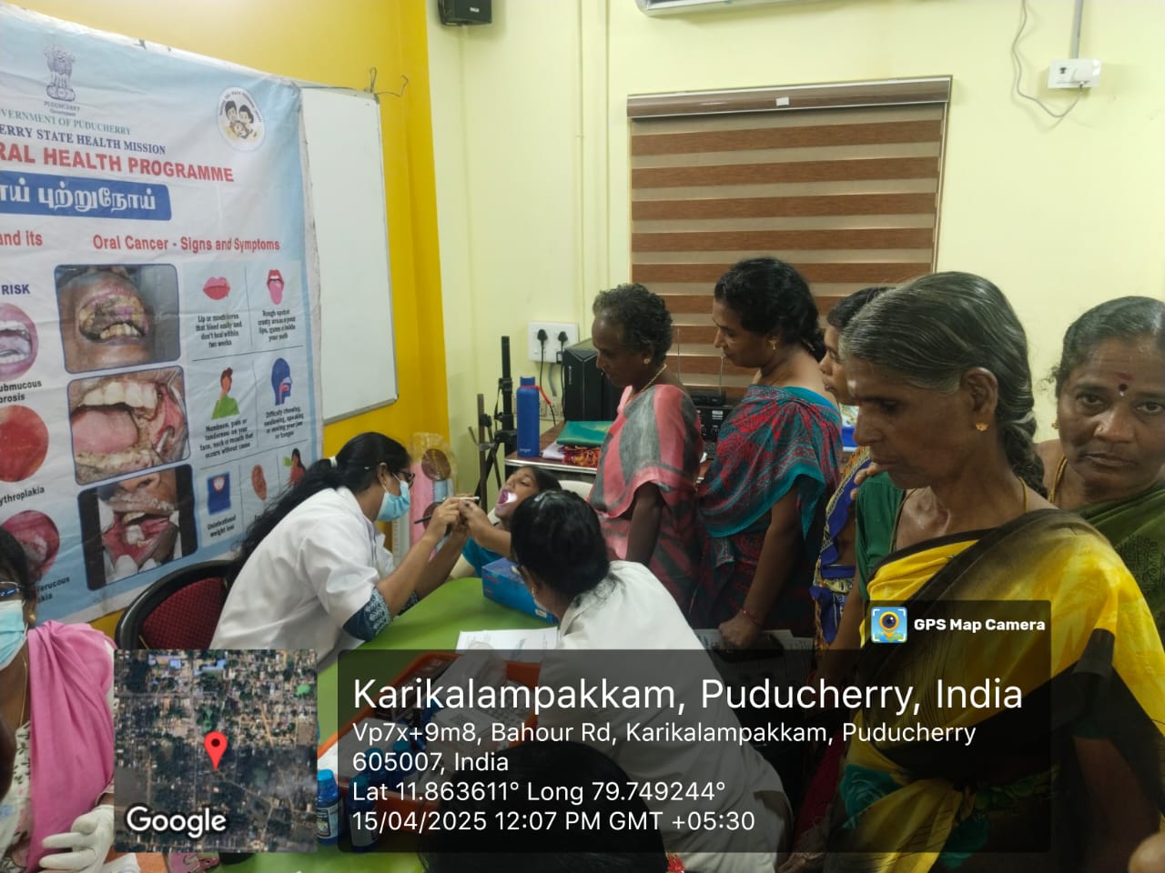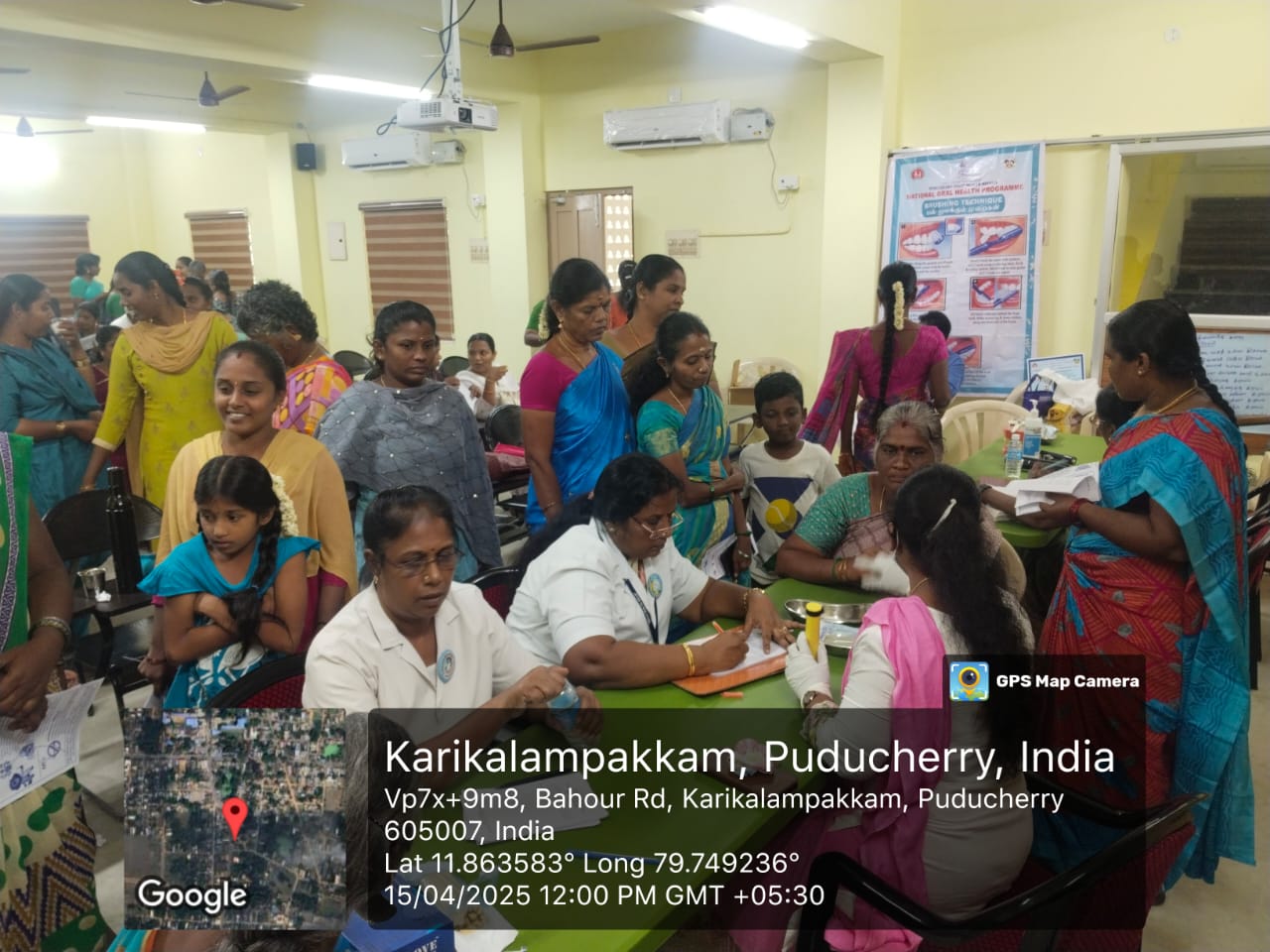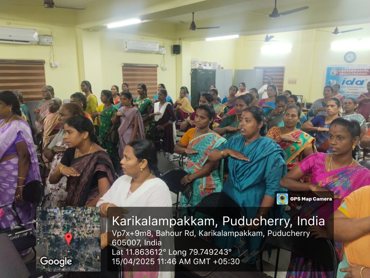 An oral health awareness and dental screening camp was successfully conducted on 15/04/2025 at the Community Managed Training Centre, Karikalampakkam , under the aegis of the Block Development Office, Ariyankuppam. The camp was organized specifically for members of Self Help Groups (SHGs) and was facilitated by the Mobile Dental Unit team under the National Oral Health Programme (NOHP) Puducherry in association with Indian Dental Association, Puducherry branch.