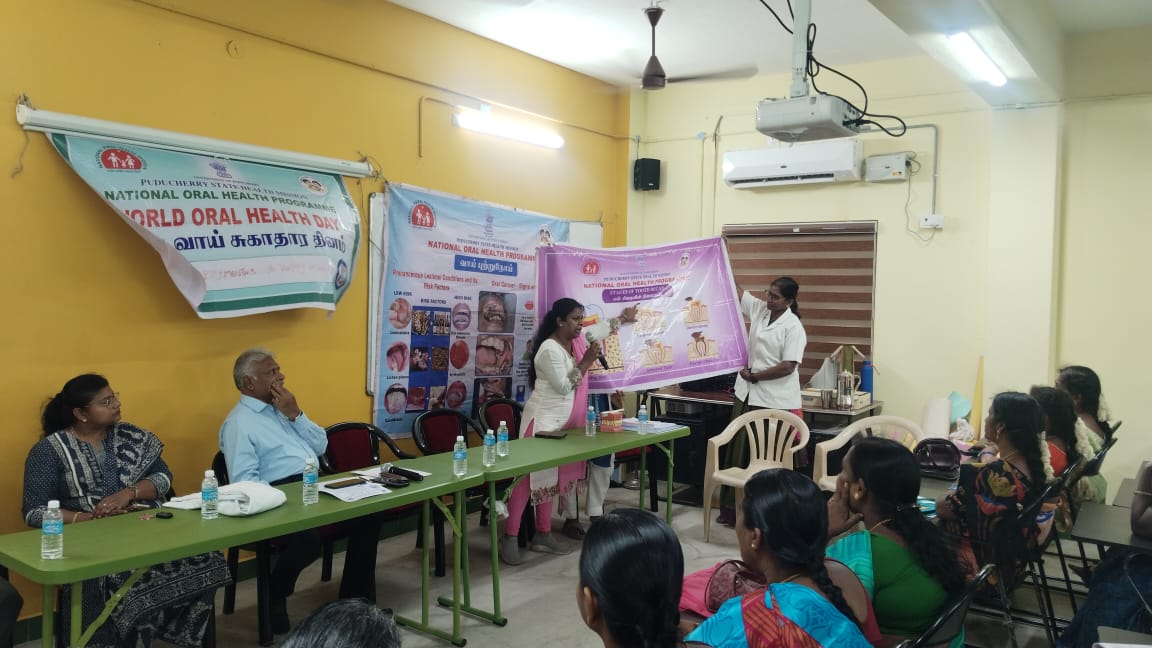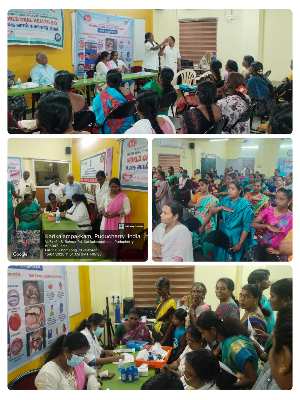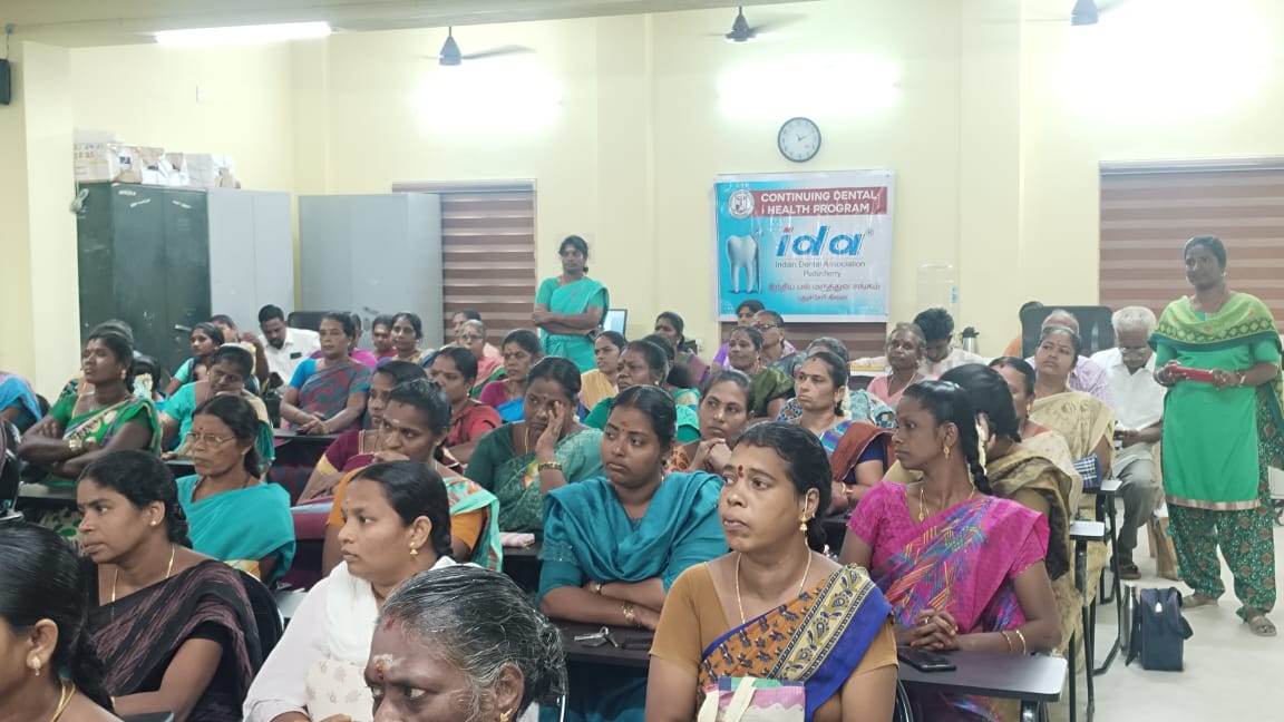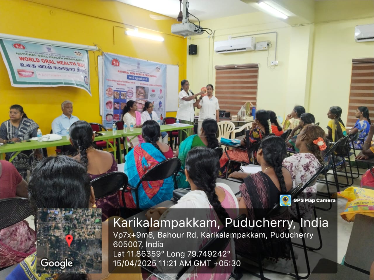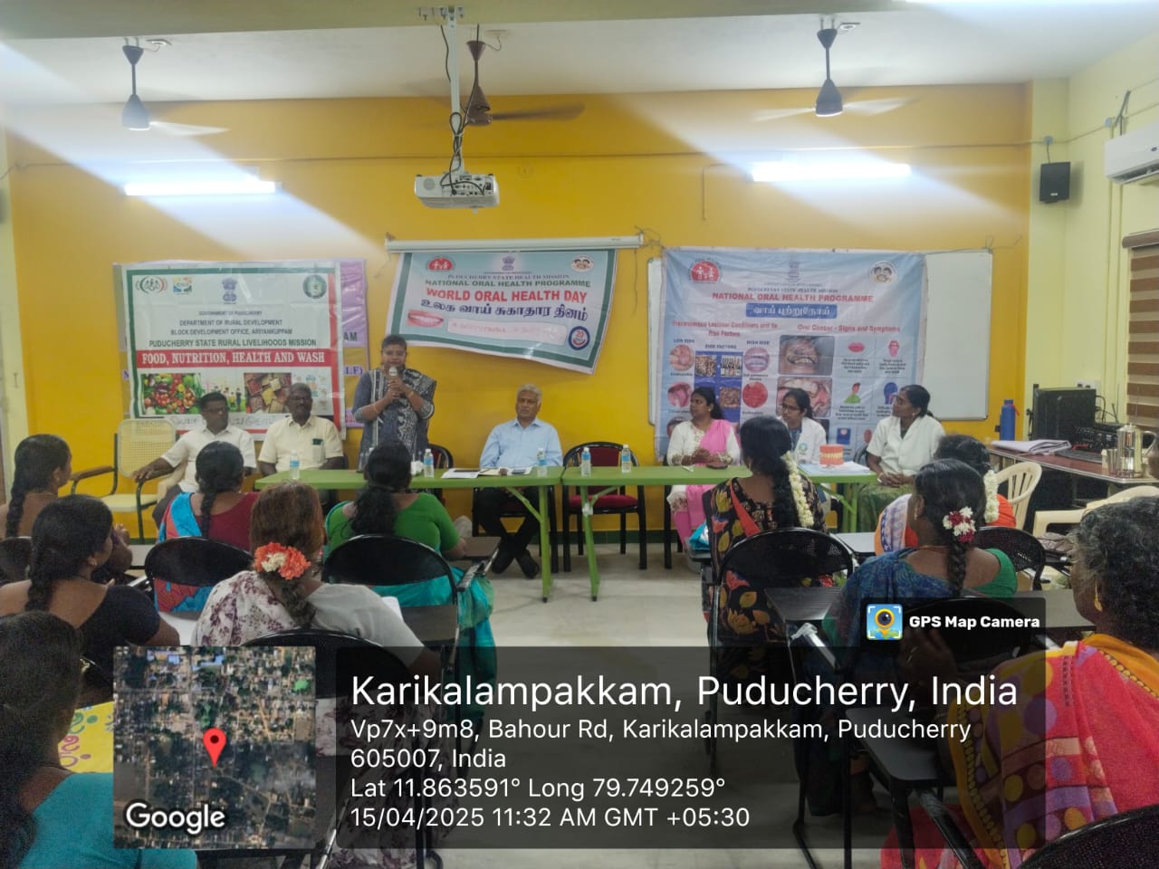 An oral health awareness and dental screening camp was successfully conducted on 15/04/2025 at the Community Managed Training Centre, Karikalampakkam , under the aegis of the Block Development Office, Ariyankuppam. The camp was organized specifically for members of Self Help Groups (SHGs) and was facilitated by the Mobile Dental Unit team under the National Oral Health Programme (NOHP) Puducherry in association with Indian Dental Association, Puducherry branch.