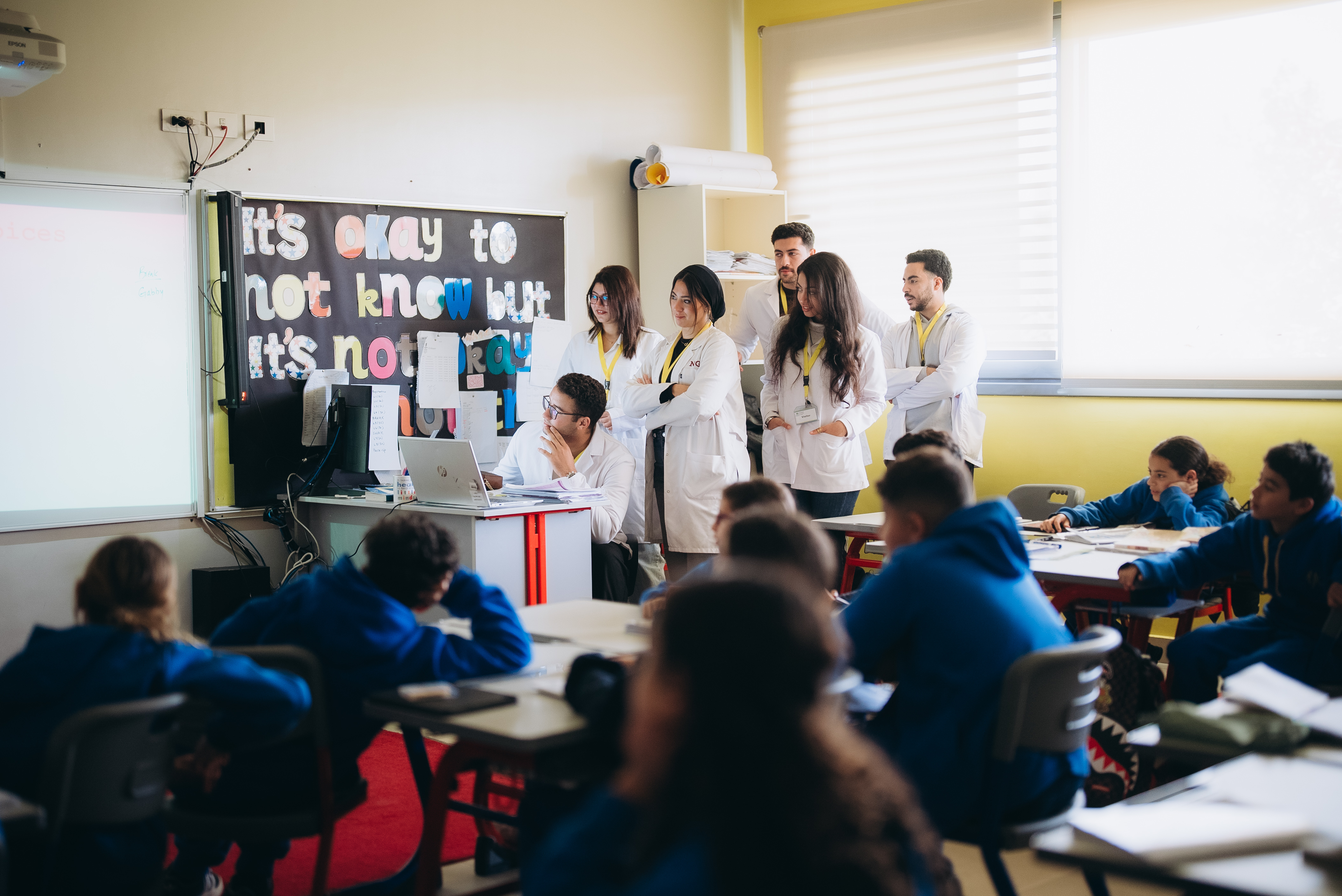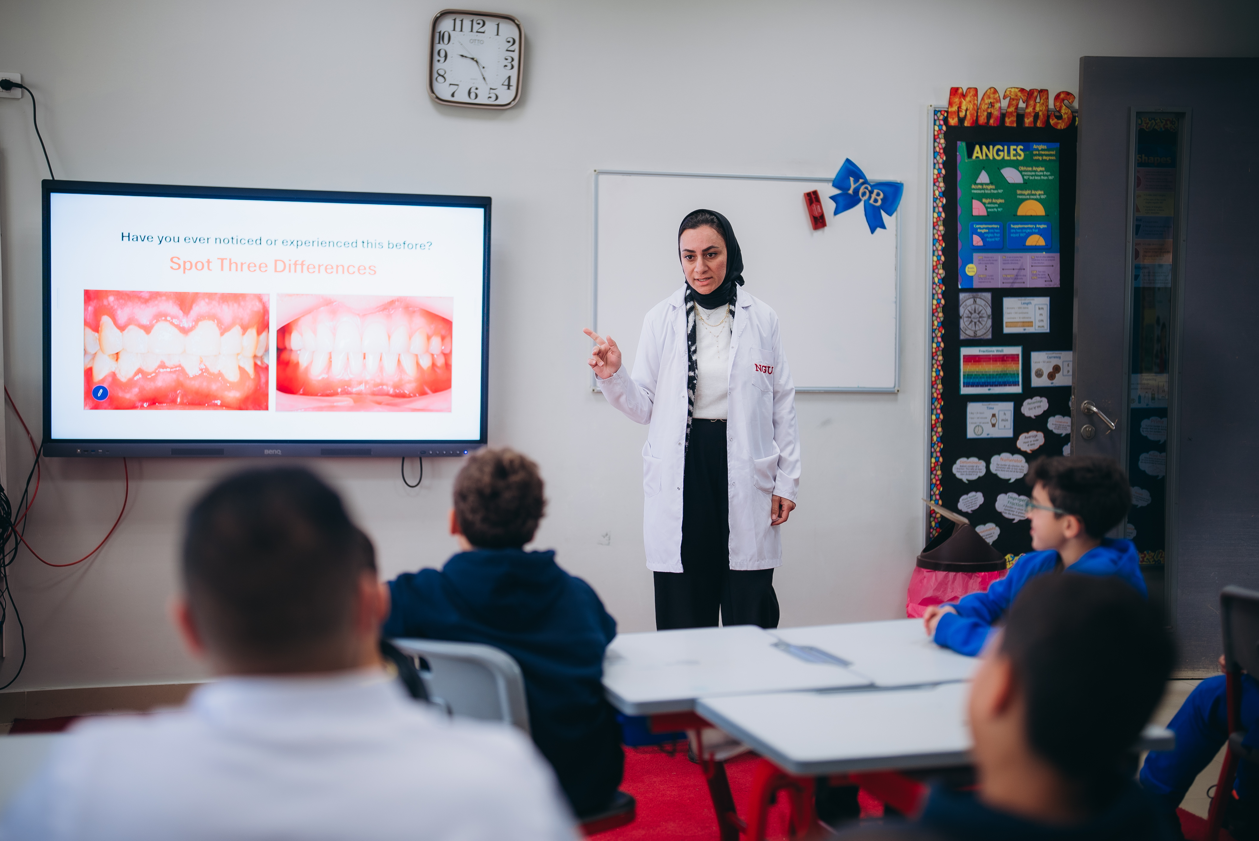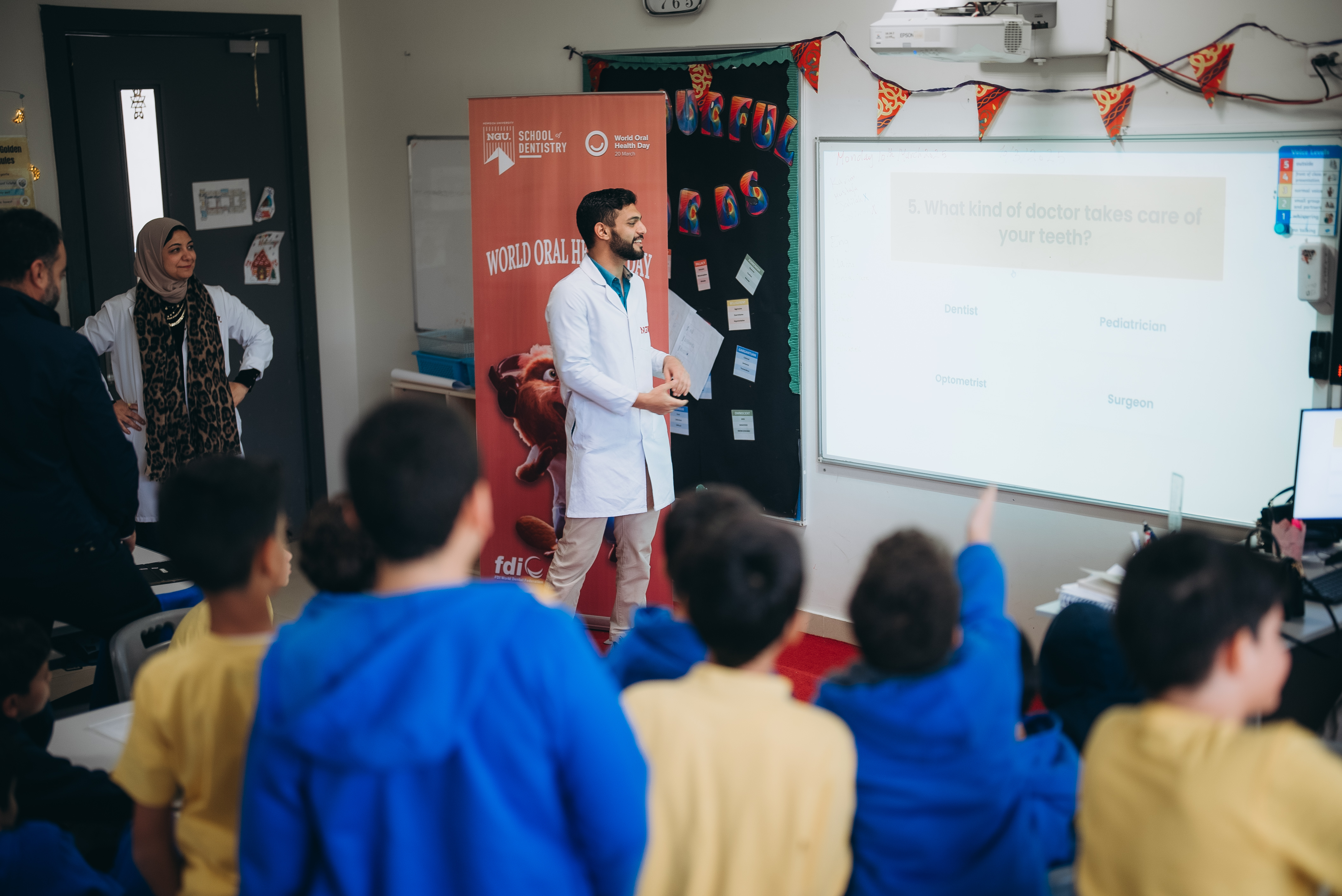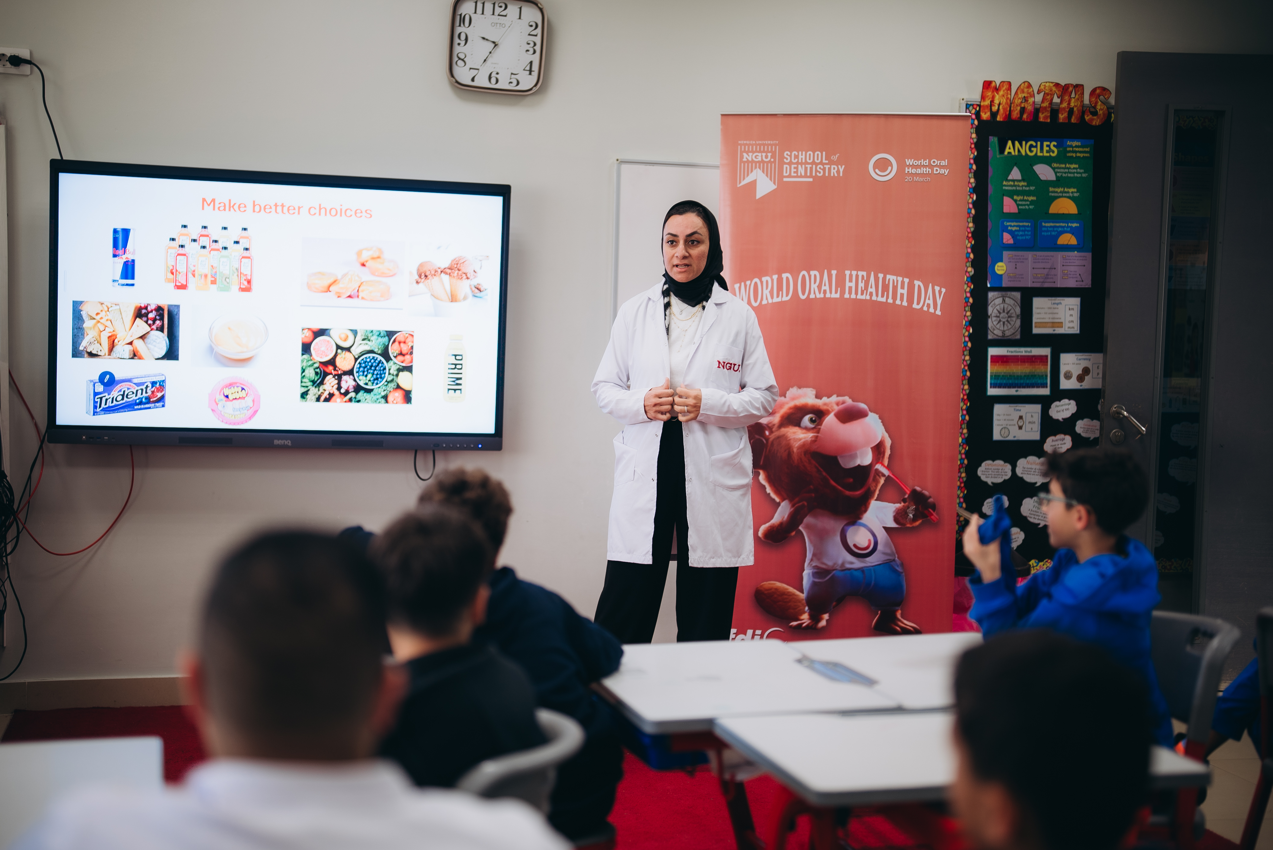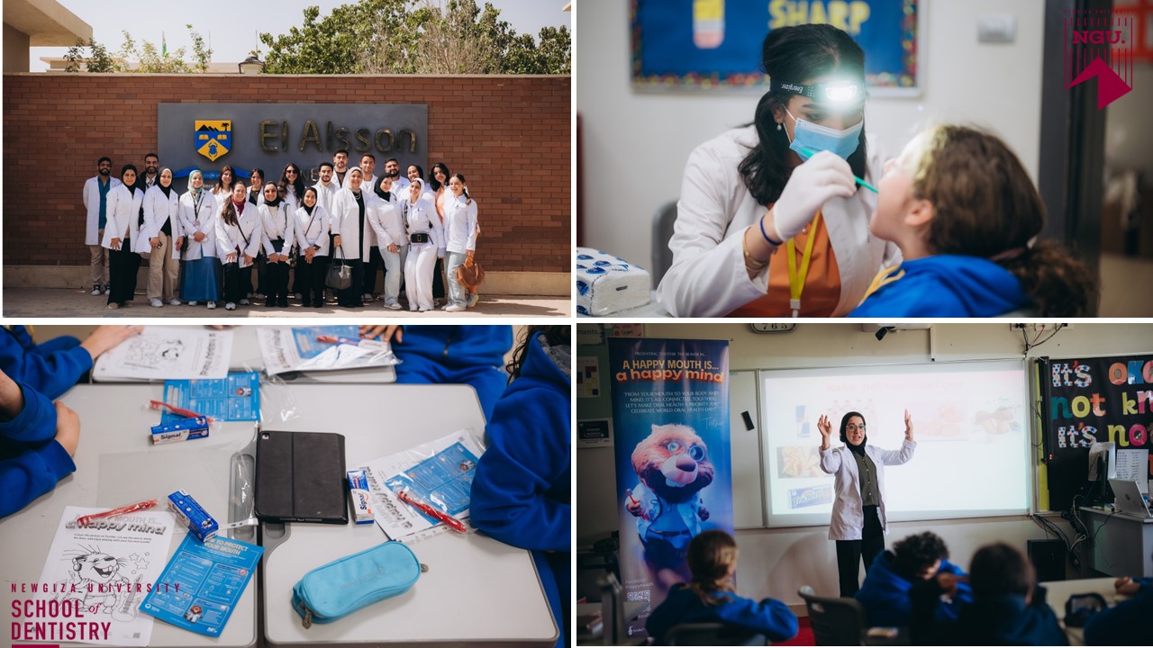 The Community Service and Environmental Affairs Committee of New Giza University’s Dental School organized a dental convoy and sessions to raise awareness through a team of professors, doctors and teaching assistants, with dental interns, by empowering the students of El Alson British & American International School teachers, and caregivers with proper oral hygiene instructions, interactive coloring papers and brushing schedules, and different handouts. Oral screening was performed as well for the children, their teachers and caregivers. Informative awareness sessions are to be carried out for all the caregivers and staff regarding oral health and hygiene awareness and the challenges and modifications that meet children with special needs and their caregivers. Handing out of giveaways of Signal toothpaste and toothbrushes is to be carried out for all the caregivers, teachers and students. Fun dental oriented trivia competitions were carried out throughout the sessions.