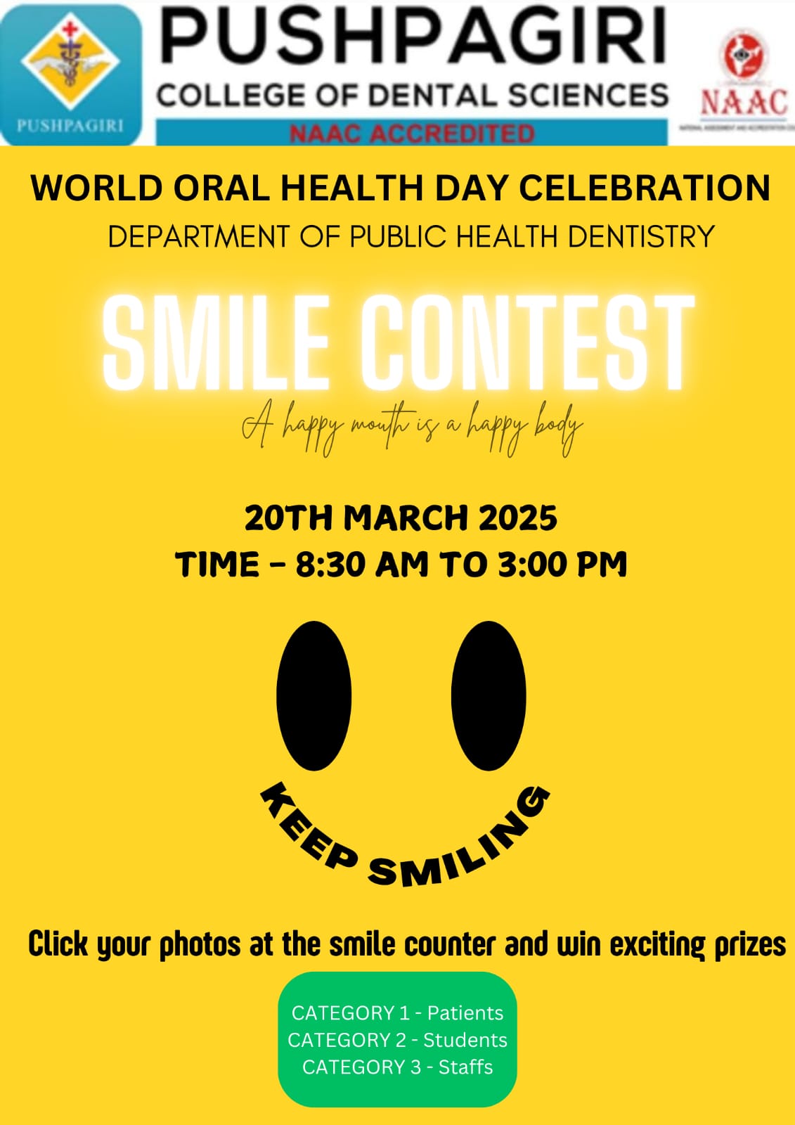 A smile contest competition was organized by Department of Public Health Dentistry, Pushpagiri College of Dental Sciences, Thiruvalla, Kerala, India on 20th March 2025. On the eve of World Oral Health Day the smile contest was conducted in 3 categories- Patient category, Staff category and Students category at the Smile Booth. The contest was attended by about 300 participants.