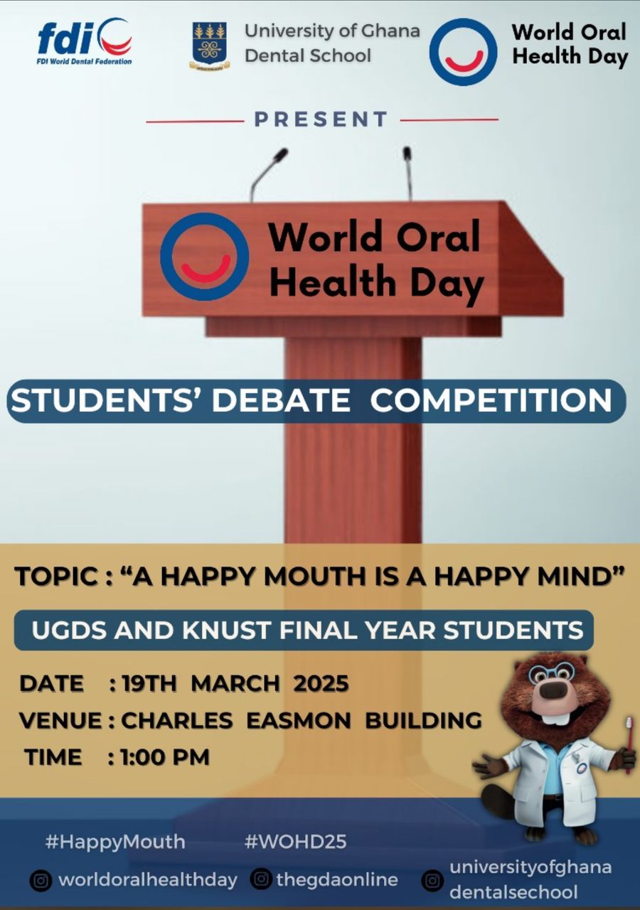 As part of World Oral Health Day 2025, the University of Ghana Dental School presents an exciting debate between University of Ghana Dental School π Kwame Nkrumah University of Science and Technology Dental School! π