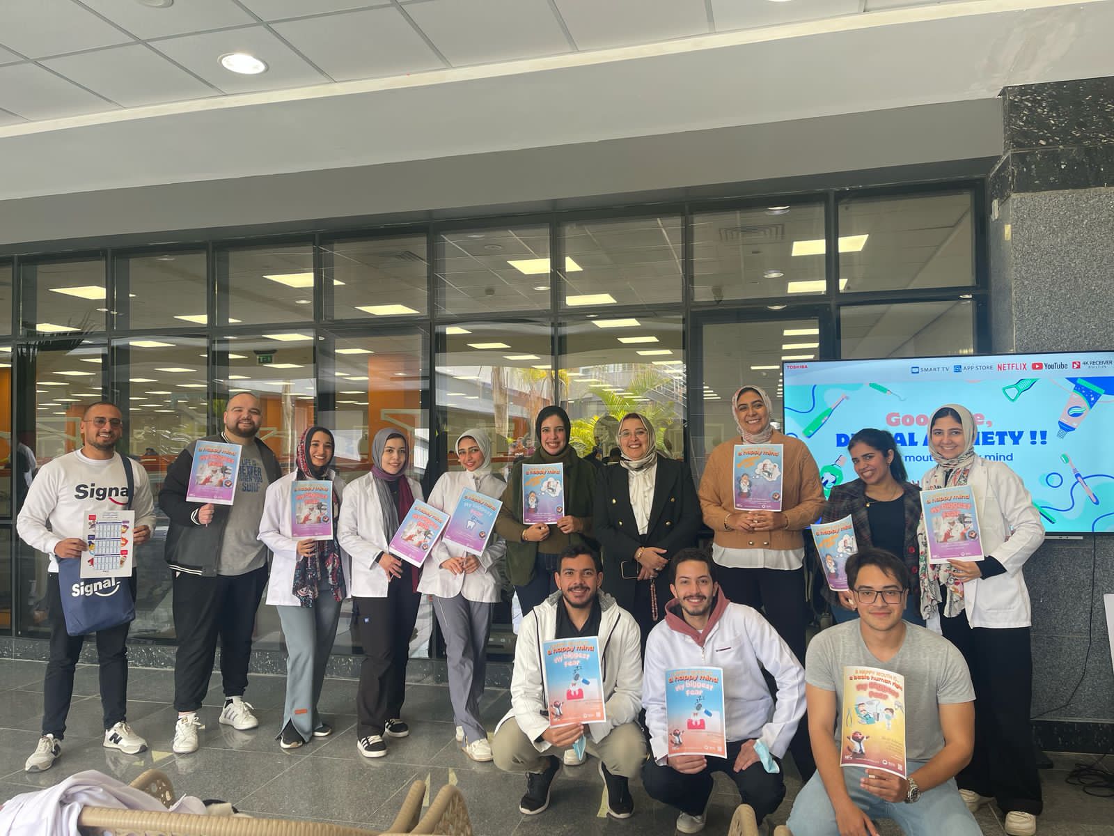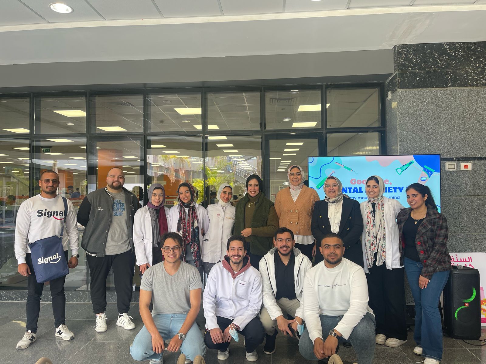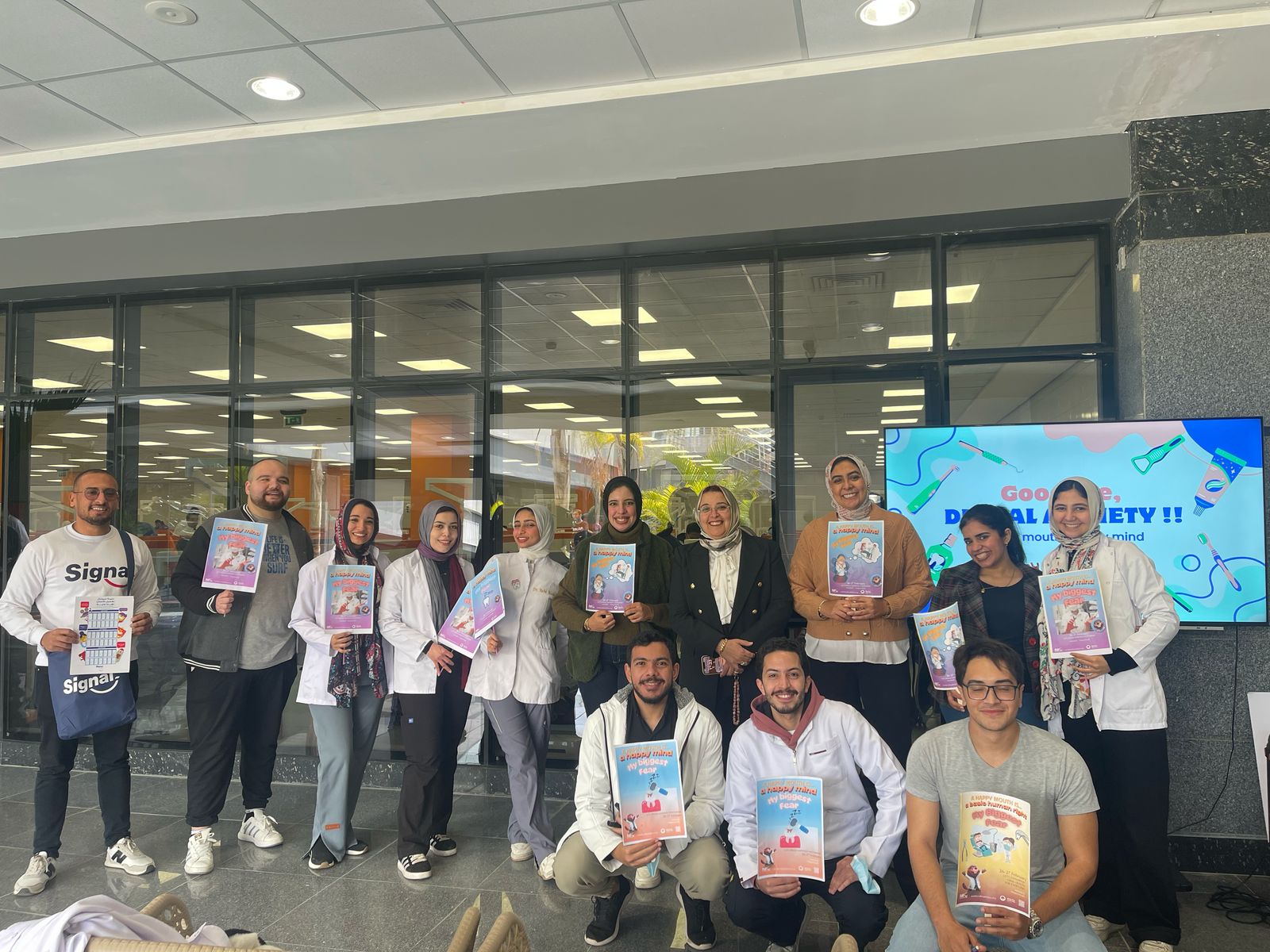 As part of World Oral Health Day at AASTMT, the dental students organized an engaging and educational event under the auspices of the dean Prof. Tarek mahmoud, and the supervison of Dr Ghada Mahmoud. The event focused on raising awareness about dental anxiety and was titled "Goodbye Dental Anxiety, A happy mouth is a happy mind". The students delivered informative lectures to both patients and fellow students on campus, exploring the causes of dental fear and practical strategies to overcome it. The students also highlighted the impact of dental anxiety on patients’ mental well-being, self-esteem and overall health, emphasizing the importance of addressing these fears early. To support their message, they created brochures and visual charts (with the patterns provided on canva) that outlined common triggers of dental anxiety, which served as a basis for open discussions with patients—helping them feel more informed, understood, and empowered in their approach to oral care. the students also distributed pamphlets to the patients and students as a take home message containing how to maintain their oral health. Our sponsors (signal egypt) gave the audiences tooth brushes and toothpaste as giveaways. As part of the event, the students offered complimentary dental check-ups to attendees.