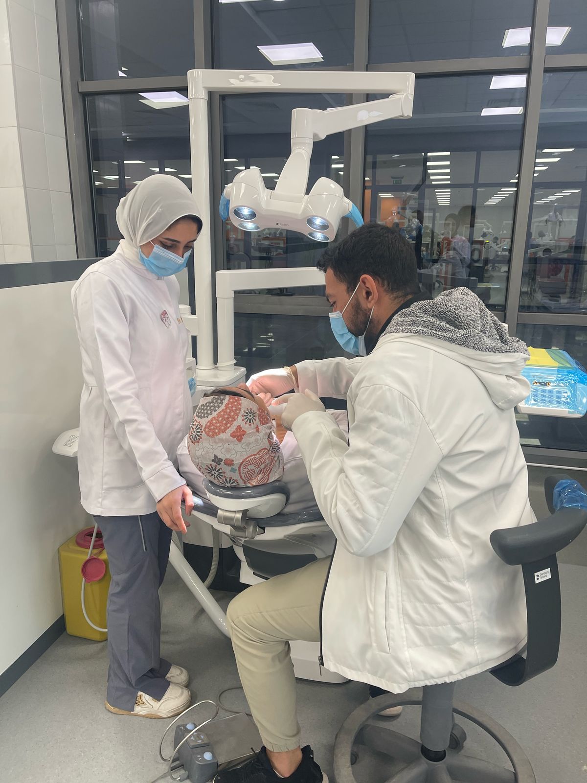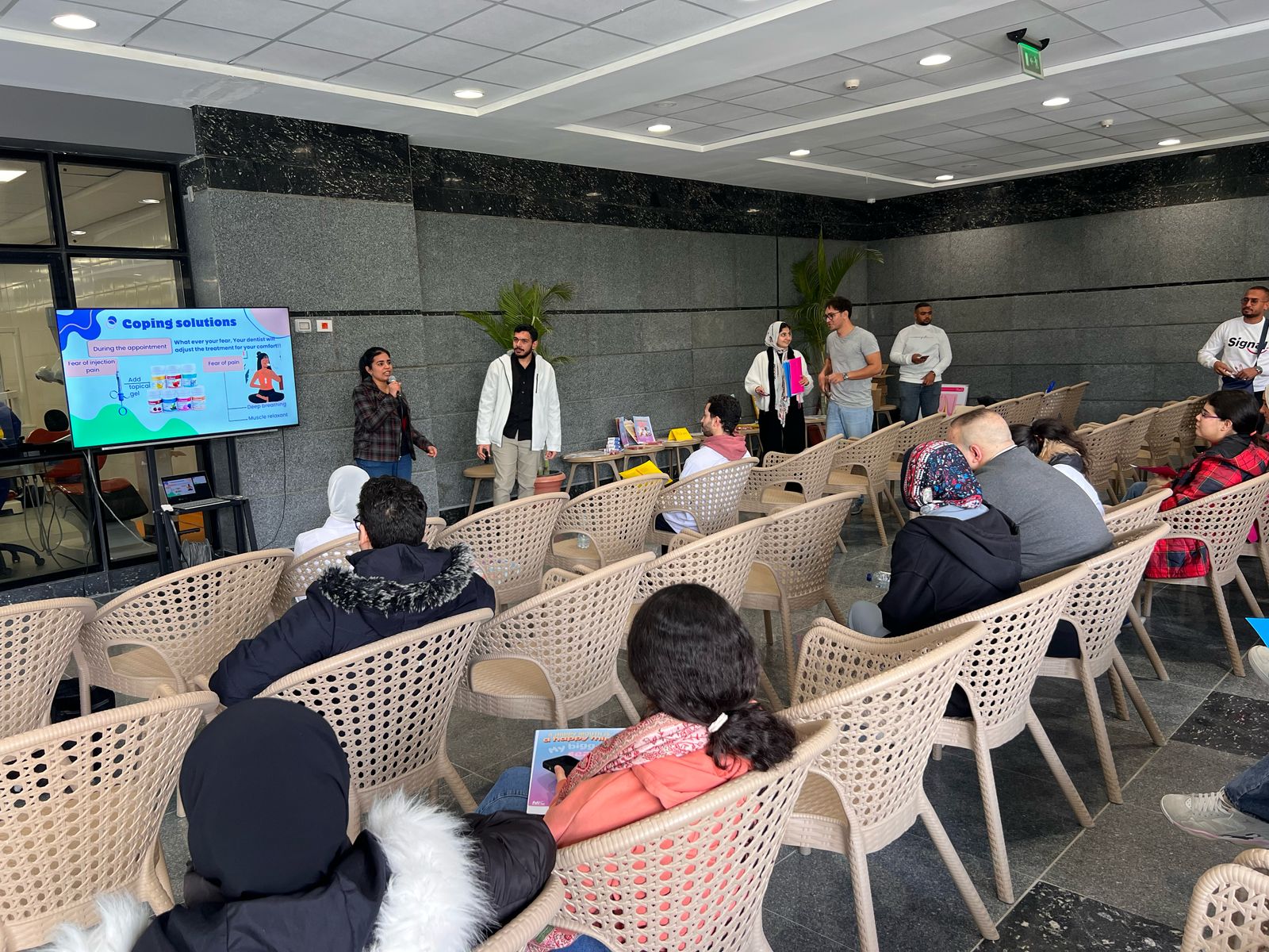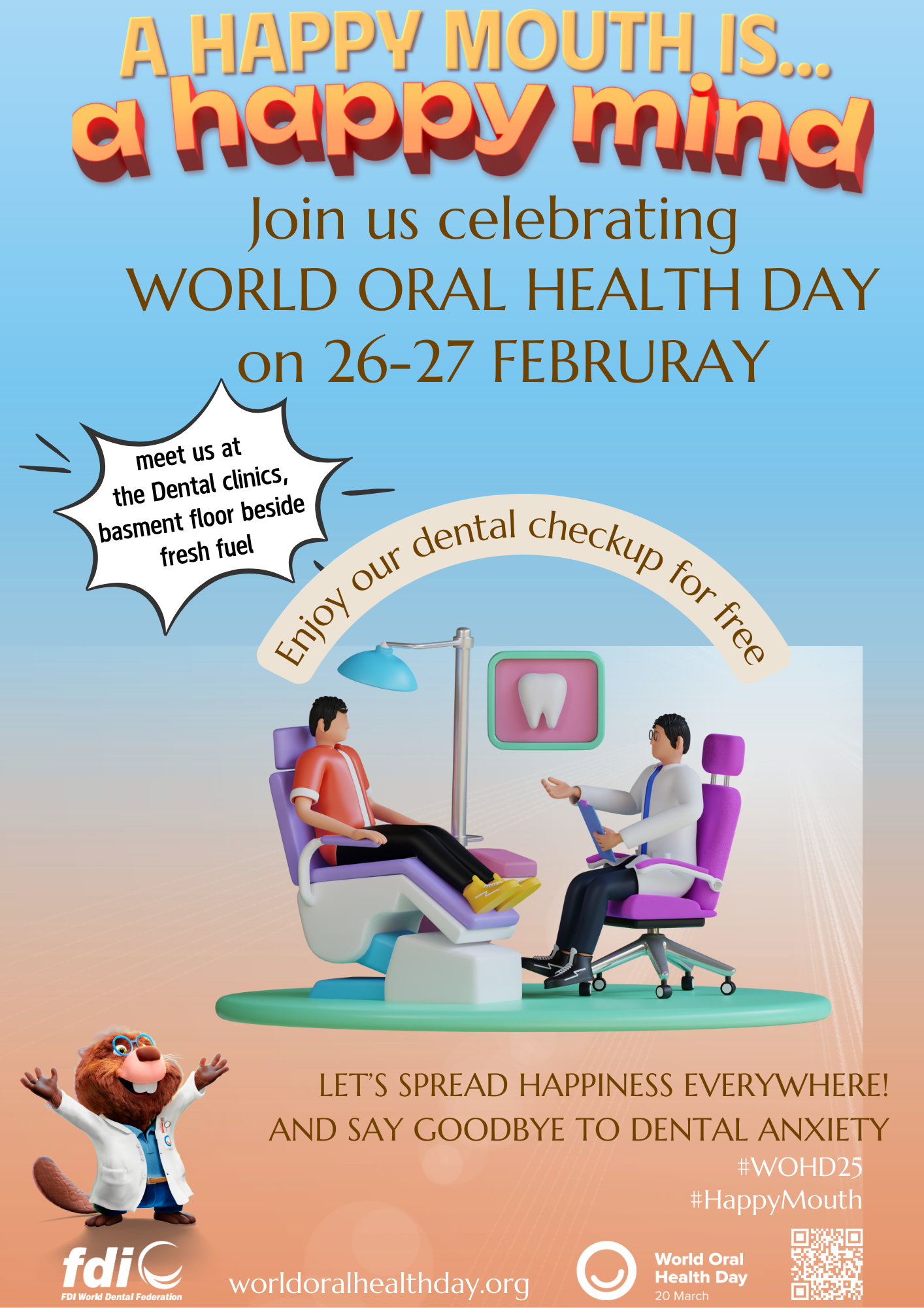 As part of World Oral Health Day at AASTMT, the dental students organized an engaging and educational event under the auspices of the dean Prof. Tarek mahmoud, and the supervison of Dr Ghada Mahmoud. The event focused on raising awareness about dental anxiety and was titled "Goodbye Dental Anxiety, A happy mouth is a happy mind". The students delivered informative lectures to both patients and fellow students on campus, exploring the causes of dental fear and practical strategies to overcome it. The students also highlighted the impact of dental anxiety on patients’ mental well-being, self-esteem and overall health, emphasizing the importance of addressing these fears early. To support their message, they created brochures and visual charts (with the patterns provided on canva) that outlined common triggers of dental anxiety, which served as a basis for open discussions with patients—helping them feel more informed, understood, and empowered in their approach to oral care. the students also distributed pamphlets to the patients and students as a take home message containing how to maintain their oral health. Our sponsors (signal egypt) gave the audiences tooth brushes and toothpaste as giveaways. As part of the event, the students offered complimentary dental check-ups to attendees.