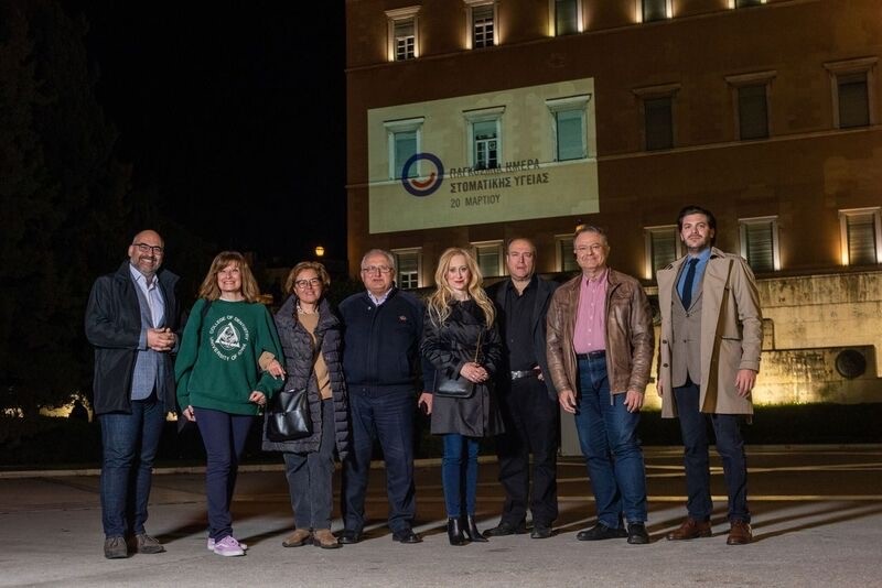 Hellenic Dental Association members displayed World Oral Health Day logo on Greek Parliament building