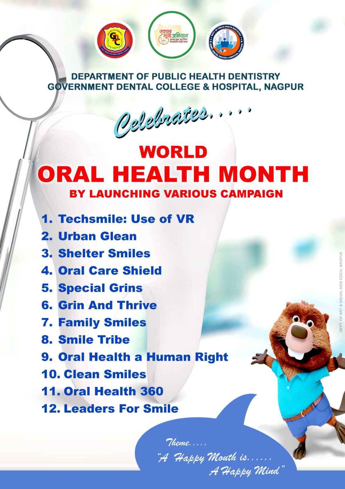 The Department of Public Health Dentistry at the Government Dental College and Hospital Nagpur organized a series of events aimed at raising awareness about oral health among the community. These events, spanning various mediums, were inaugurated on 20th March by the esteemed Dean of the institution, and continued till 20th April.